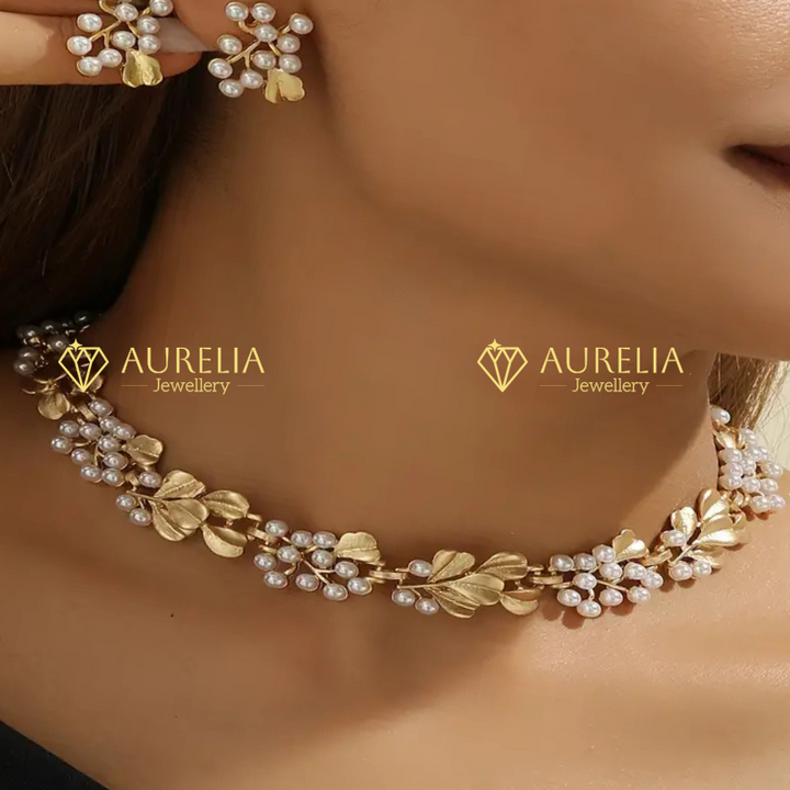 Elegant Boho-Chic Faux Pearl & Golden Leaf Jewelry Set - Vintage-Inspired Necklace and Earrings, Zinc Alloy, Perfect for Daily Wear or Parties, Vintage Jewelry