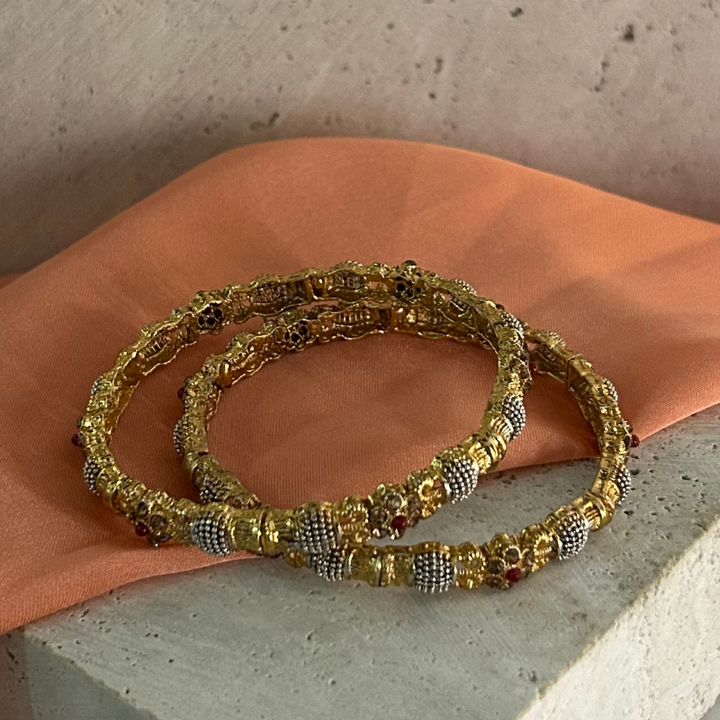 pair of These bangles feature a delicate design with alternating gold and silver segments, each adorned with intricate beadwork and small, red stones, adding a touch of elegance and sophistication. The bangles are displayed against a neutral background, highlighting their detailed craftsmanship and making them suitable for both everyday wear and special occasions.