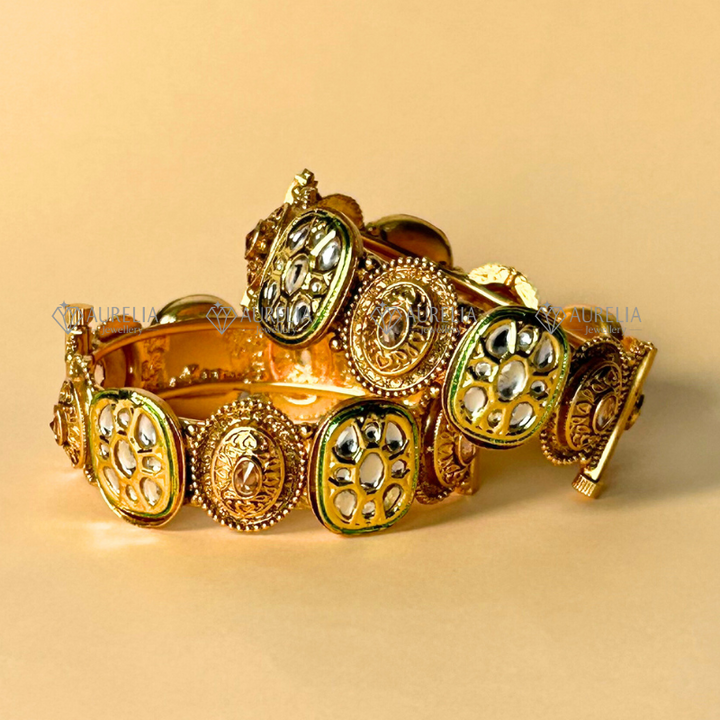 This 1 Pcs is a stunning, gold-plated Kundan bracelet, adorned with intricate detailing and colorful gemstones. The bracelet features a series of linked circular and oval motifs, each set with sparkling Kundan stones and ruby-colored accents. Its design exudes a regal and traditional charm, perfect for adding a touch of elegance to any outfit.