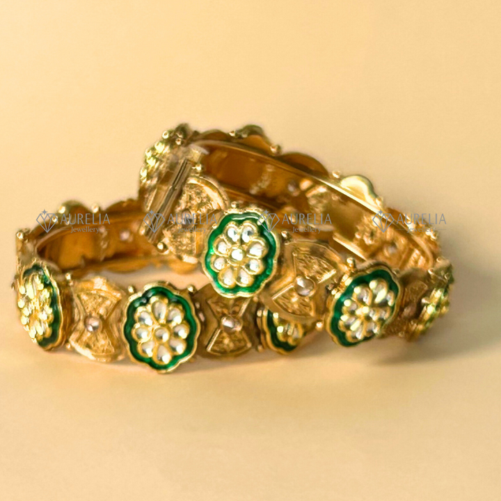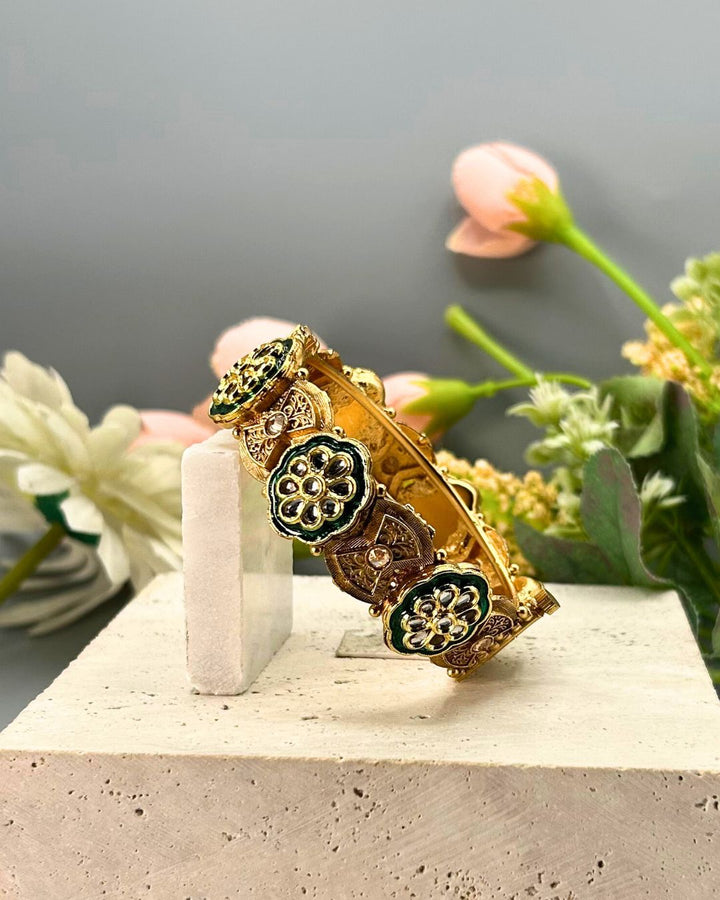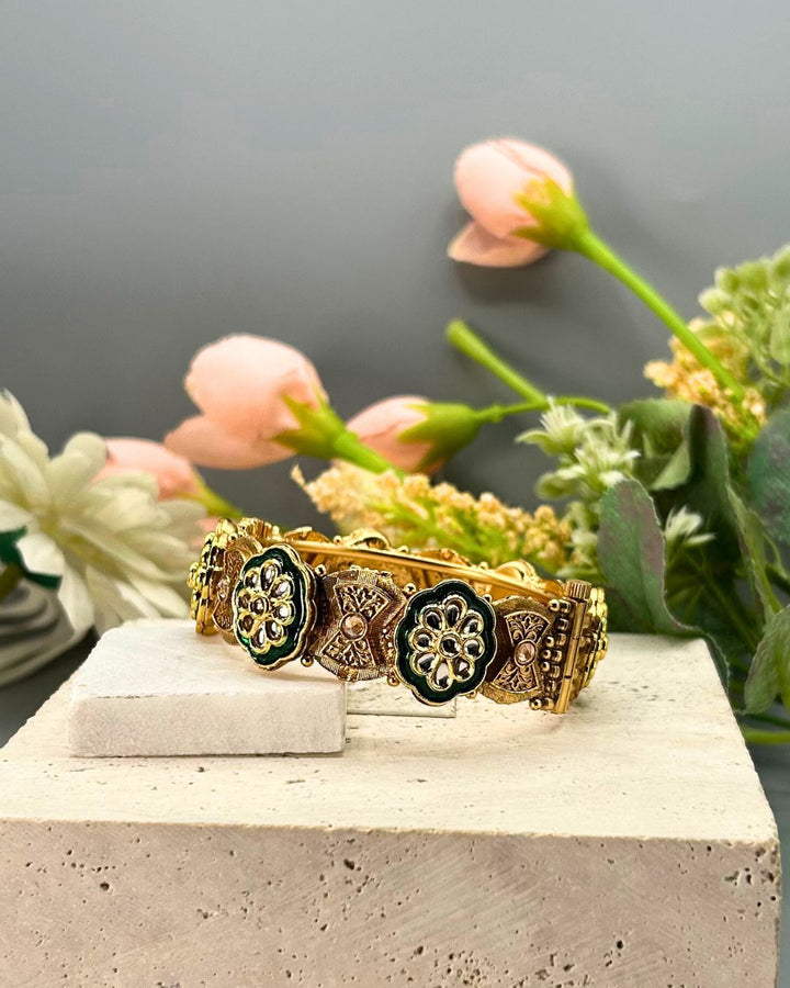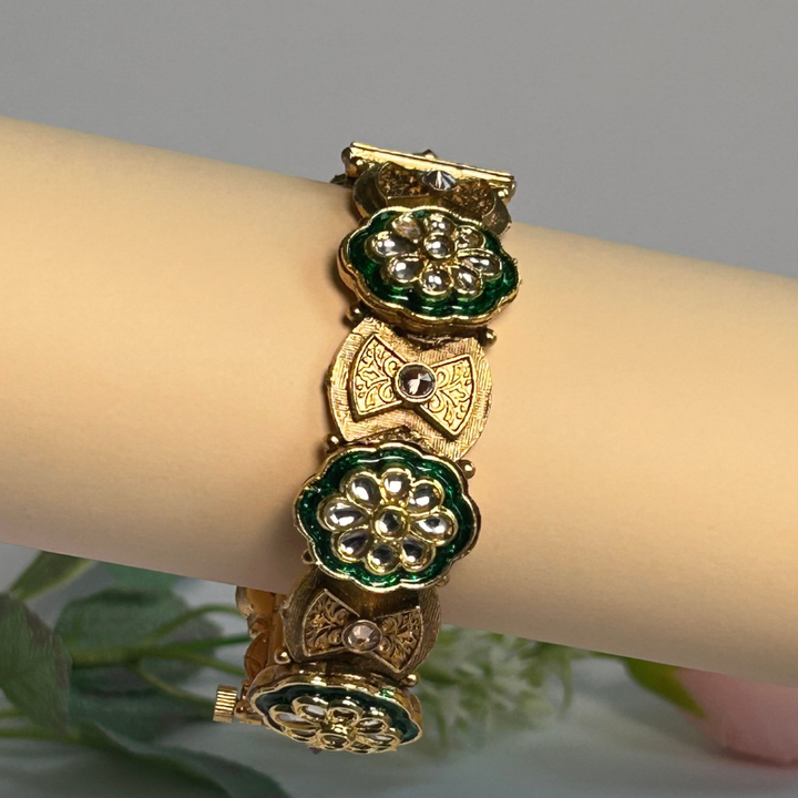 This 1 Pcs is a stunning, gold-plated Kundan bracelet, adorned with intricate detailing and colorful gemstones. The bracelet features a series of linked circular and oval motifs, each set with sparkling Kundan stones and ruby-colored accents. Its design exudes a regal and traditional charm, perfect for adding a touch of elegance to any outfit.