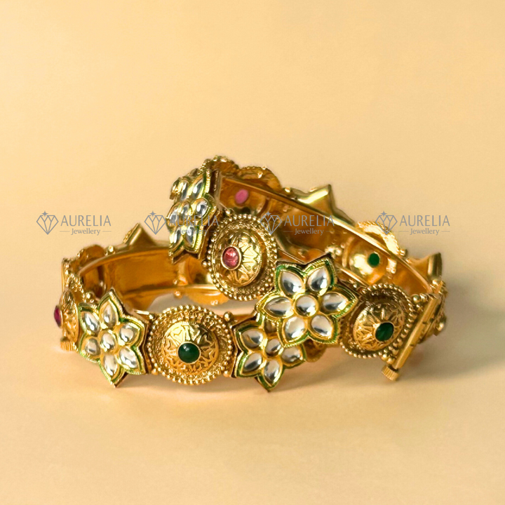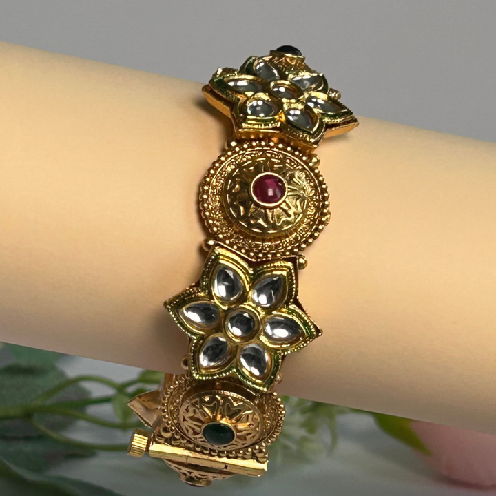 This 1 Pcs is a stunning, gold-plated Kundan bracelet, adorned with intricate detailing and colorful gemstones. The bracelet features a series of linked circular and oval motifs, each set with sparkling Kundan stones and ruby-colored accents. Its design exudes a regal and traditional charm, perfect for adding a touch of elegance to any outfit.