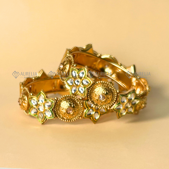 This 1 Pcs is a stunning, gold-plated Kundan bracelet, adorned with intricate detailing and colorful gemstones. The bracelet features a series of linked circular and oval motifs, each set with sparkling Kundan stones and ruby-colored accents. Its design exudes a regal and traditional charm, perfect for adding a touch of elegance to any outfit.