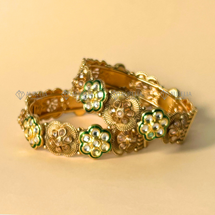 This 1 Pcs is a stunning, gold-plated Kundan bracelet, adorned with intricate detailing and colorful gemstones. The bracelet features a series of linked circular and oval motifs, each set with sparkling Kundan stones and ruby-colored accents. Its design exudes a regal and traditional charm, perfect for adding a touch of elegance to any outfit.