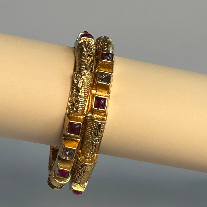 1 Piar of these elegant gold-plated bangles are adorned with delicate pearls and emerald green stones, creating a sophisticated floral pattern. The intricate detailing and contrasting colors make them perfect for adding a touch of glamour to any occasion, from weddings to parties, or even for everyday wear. They are made from durable, high-quality materials and are designed to last, ensuring lasting beauty and elegance.¬¨‚Äâ€