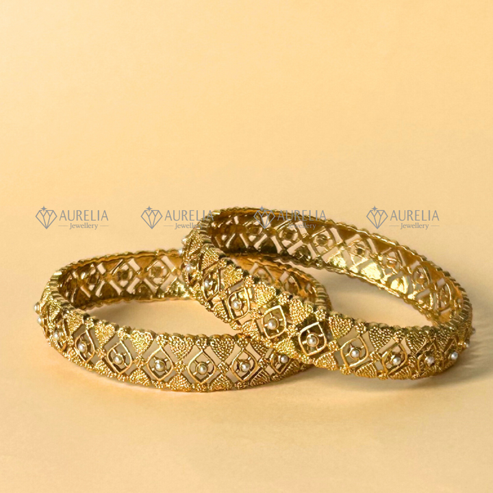 1 Piar of these elegant gold-plated bangles are adorned with delicate pearls and emerald green stones, creating a sophisticated floral pattern. The intricate detailing and contrasting colors make them perfect for adding a touch of glamour to any occasion, from weddings to parties, or even for everyday wear. They are made from durable, high-quality materials and are designed to last, ensuring lasting beauty and elegance.¬¨‚Äâ€