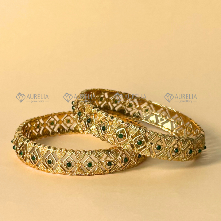 1 Piar of these elegant gold-plated bangles are adorned with delicate pearls and emerald green stones, creating a sophisticated floral pattern. The intricate detailing and contrasting colors make them perfect for adding a touch of glamour to any occasion, from weddings to parties, or even for everyday wear. They are made from durable, high-quality materials and are designed to last, ensuring lasting beauty and elegance.¬¨‚Äâ€