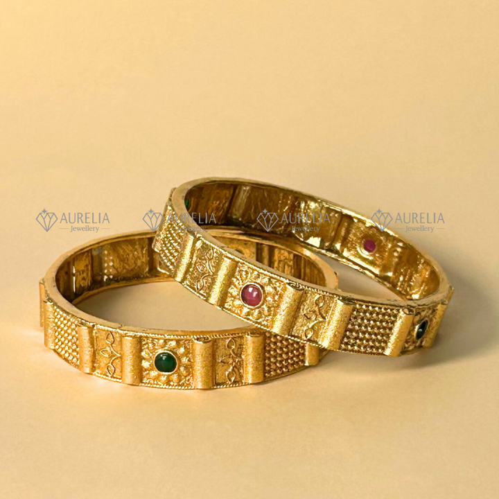 1 Piar of these elegant gold-plated bangles are adorned with delicate pearls and emerald green stones, creating a sophisticated floral pattern. The intricate detailing and contrasting colors make them perfect for adding a touch of glamour to any occasion, from weddings to parties, or even for everyday wear. They are made from durable, high-quality materials and are designed to last, ensuring lasting beauty and elegance.¬¨‚Äâ€