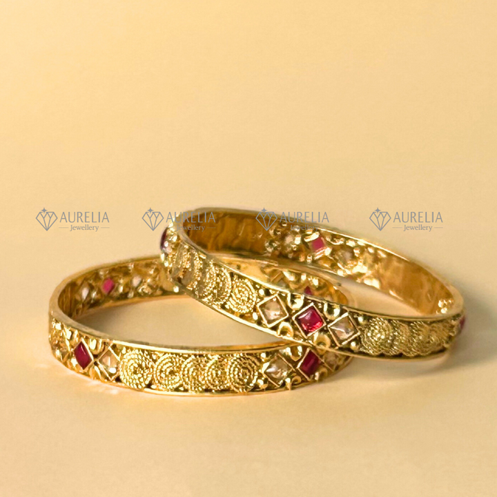 1 Piar of these elegant gold-plated bangles are adorned with delicate pearls and emerald green stones, creating a sophisticated floral pattern. The intricate detailing and contrasting colors make them perfect for adding a touch of glamour to any occasion, from weddings to parties, or even for everyday wear. They are made from durable, high-quality materials and are designed to last, ensuring lasting beauty and elegance.¬¨‚Äâ€