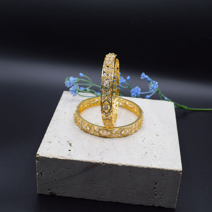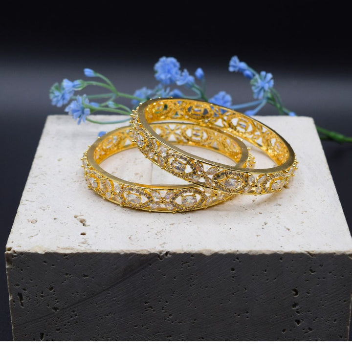 Add dazzling sparkle to your wrist with our beautiful Golden Bangle! It shines bright with 1-karat equivalent zircons and features an intricate design. Perfect for weddings, parties, or any special celebration.