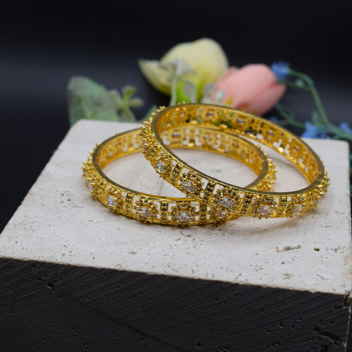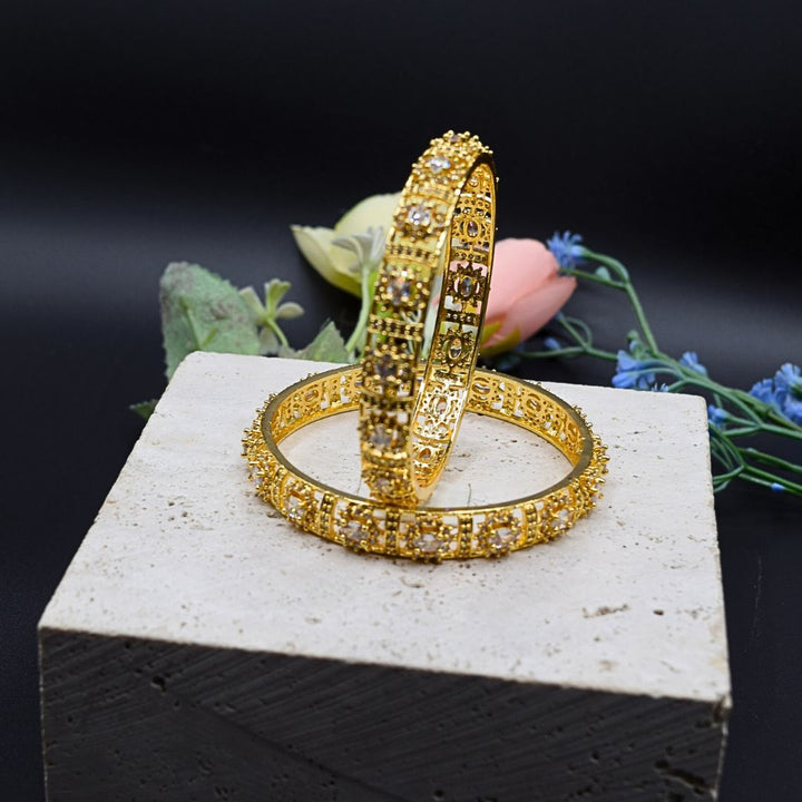 Add dazzling sparkle to your wrist with our beautiful Golden Bangle! It shines bright with 1-karat equivalent zircons and features an intricate design. Perfect for weddings, parties, or any special celebration.