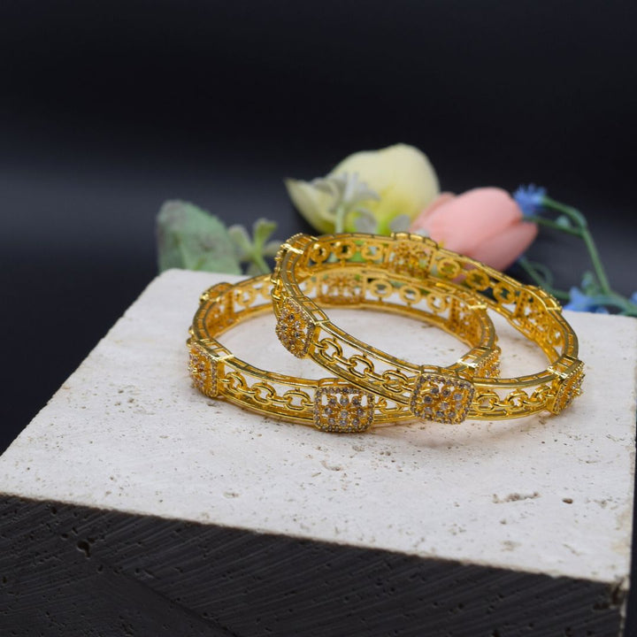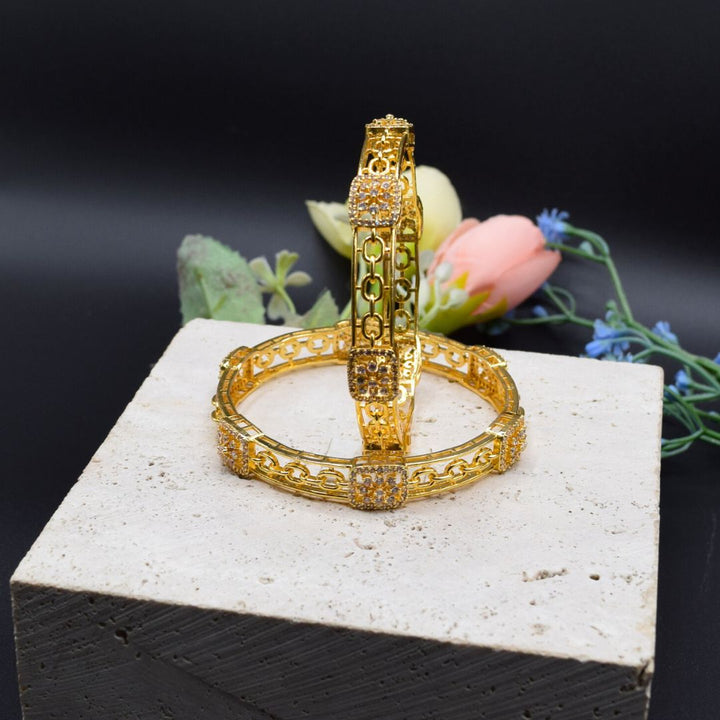 Add dazzling sparkle to your wrist with our beautiful Golden Bangle! It shines bright with 1-karat equivalent zircons and features an intricate design. Perfect for weddings, parties, or any special celebration.