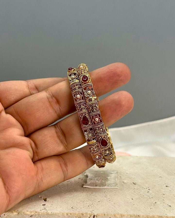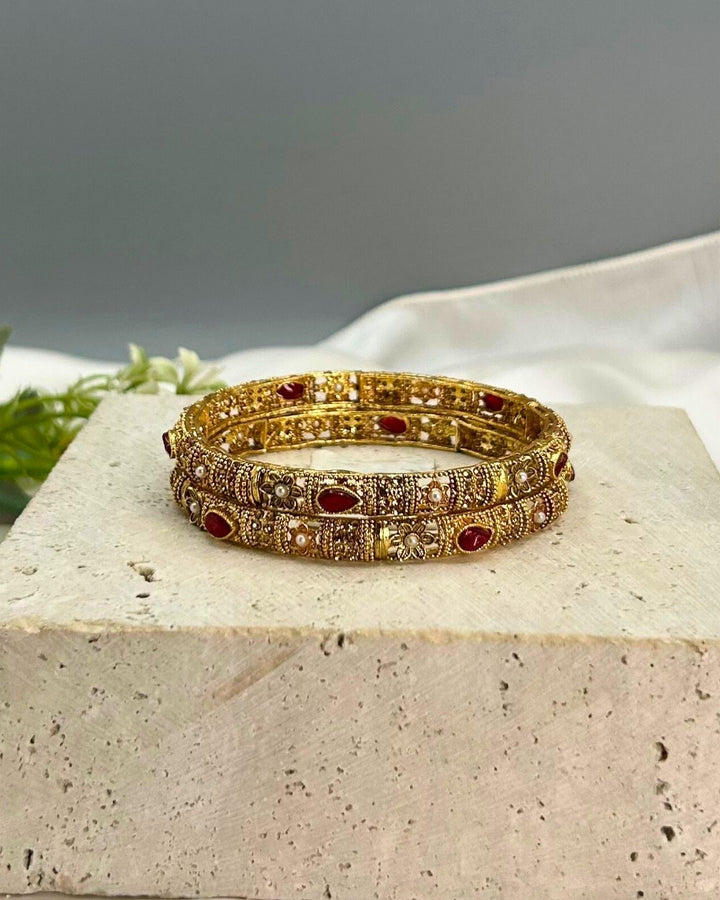 Enhance your wrist with these exquisite women's bangles crafted from metal with intricate stone work in a captivating ruby red hue. This set of 2 pieces exudes a timeless and elegant charm, perfect for adding a touch of sophistication to your outfit. Elevate your style effortlessly with these stunning bangles from Aurelia.Pk.