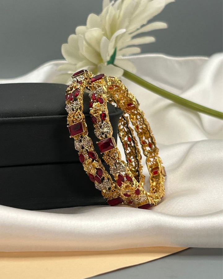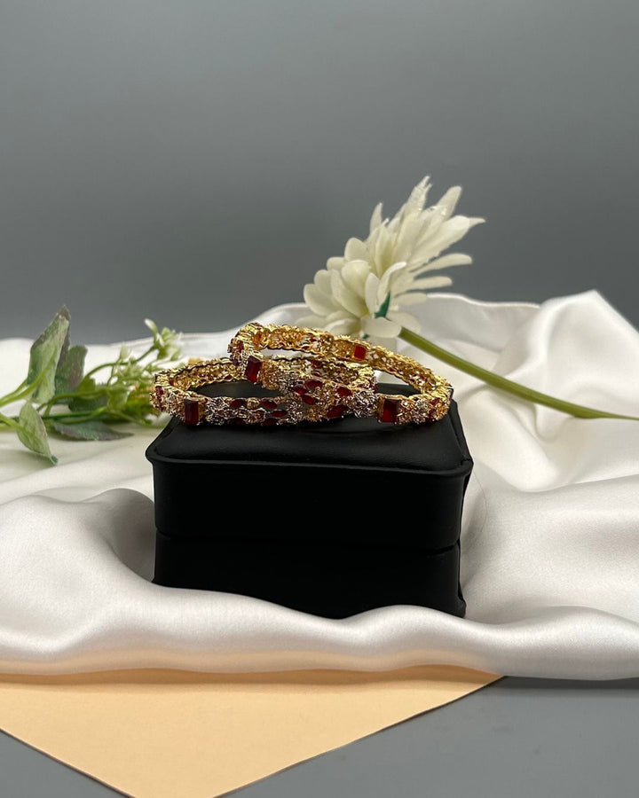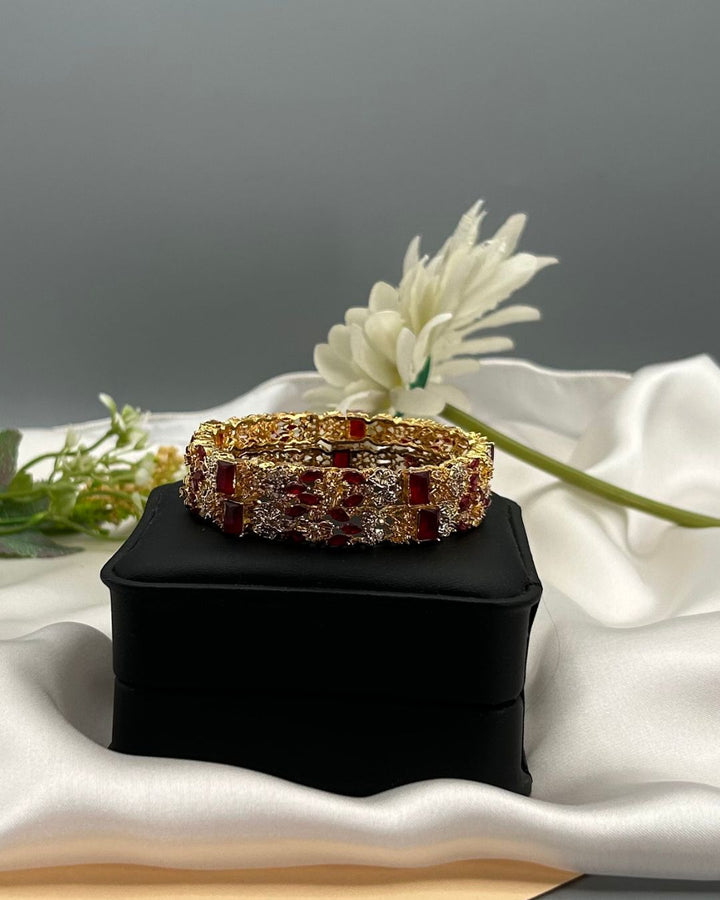 These exquisite bangles feature a dazzling stone work technique in a striking ruby red hue. Crafted from sturdy metal, this 2-piece set exudes elegance and sophistication. Perfect for adding a pop of color to any outfit, these bangles are a timeless addition to any jewelry collection. Brand name: Aurelia.Pk.