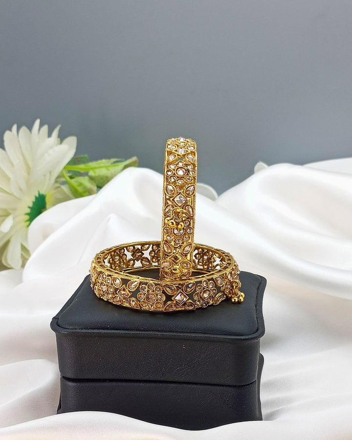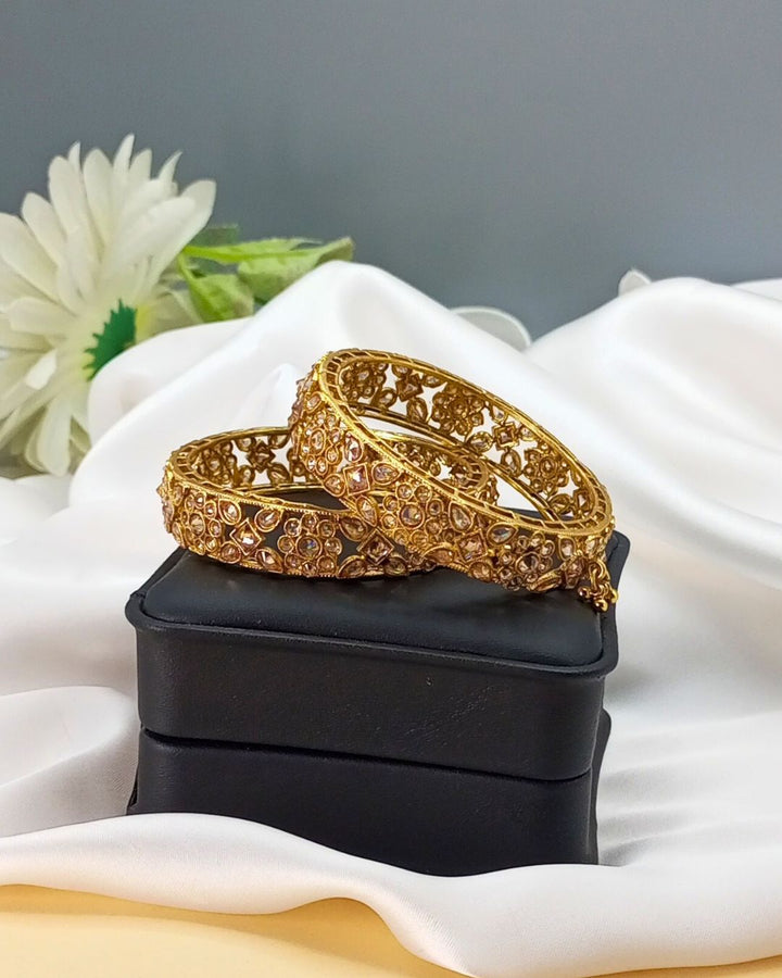 Elevate your wrist game with this exquisite 2 Piece bangle set from Aurelia.Pk. Crafted from sleek metal and adorned with intricate stone work in a luminous pearl white hue, these bangles exude a sophisticated charm. Perfect for adding a touch of elegance to any outfit, these pieces are a must-have for every fashion-forward woman.