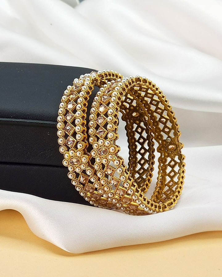 Elevate your wrist game with this exquisite 2 Piece bangle set from Aurelia.Pk. Crafted from sleek metal and adorned with intricate stone work in a luminous pearl white hue, these bangles exude a sophisticated charm. Perfect for adding a touch of elegance to any outfit, these pieces are a must-have for every fashion-forward woman.