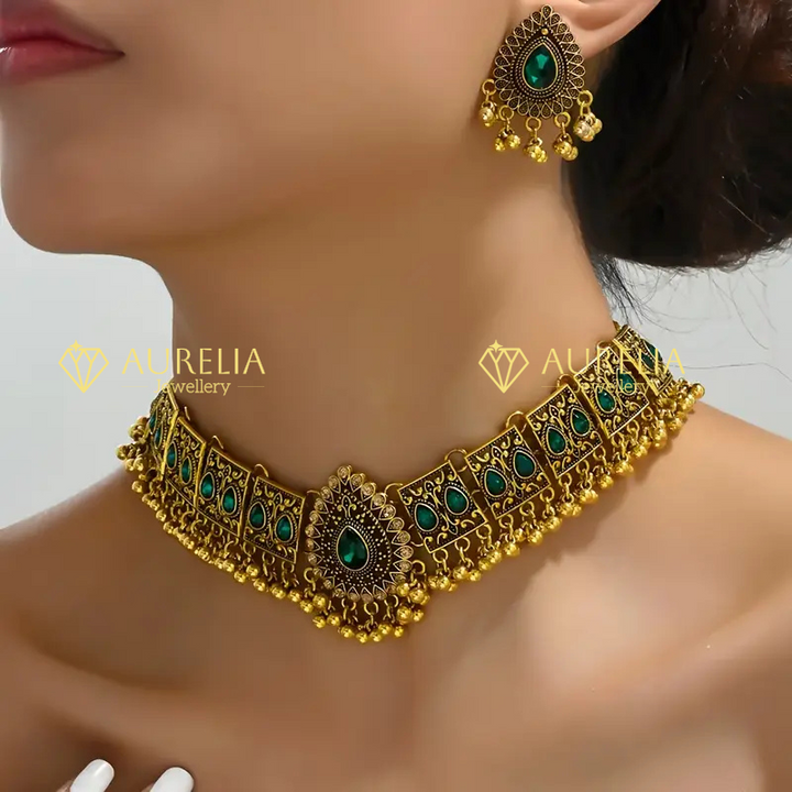 Bollywood Style 1 Pair Of Earrings + 1 Necklace Vintage Jewelry Set Retro Design Inlaid Gemstone Match Daily Outfits Party Accessories