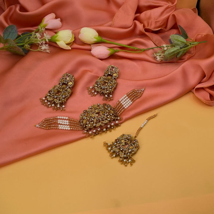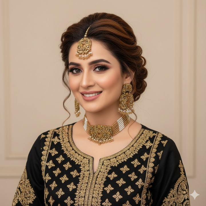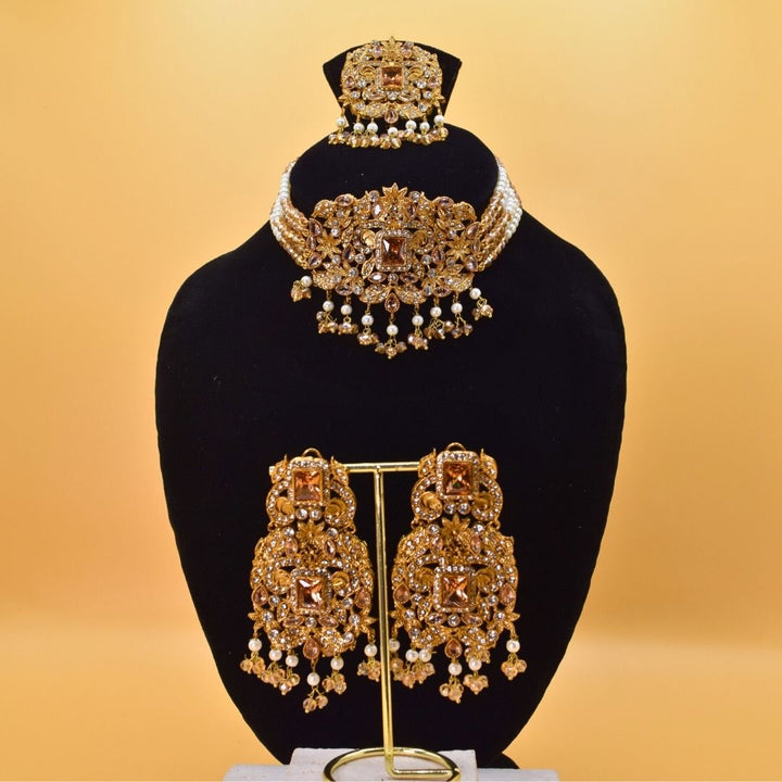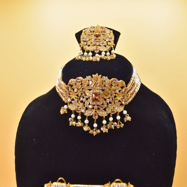 Elegant choker set with matching earrings and tikka. Sparkling stones shine in every detail. Perfect for parties or special occasions. Adds grace and bold style.