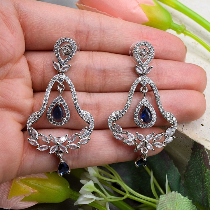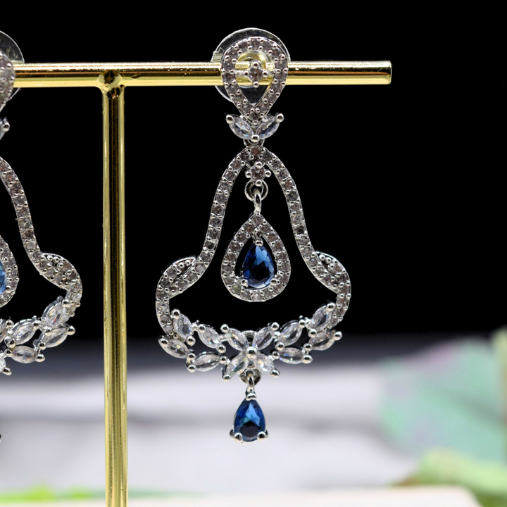 Add amazing sparkle with our beautiful Silver Earrings! They feature a dazzling 1-carat blue American Zircon stone and smaller shiny clear stones. These elegant drop earrings are perfect for parties, weddings, or any special event. They will make you stand out
