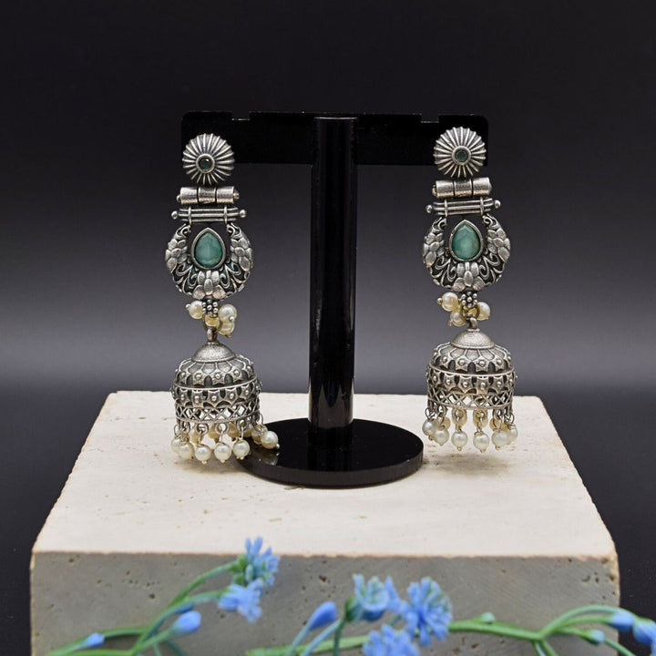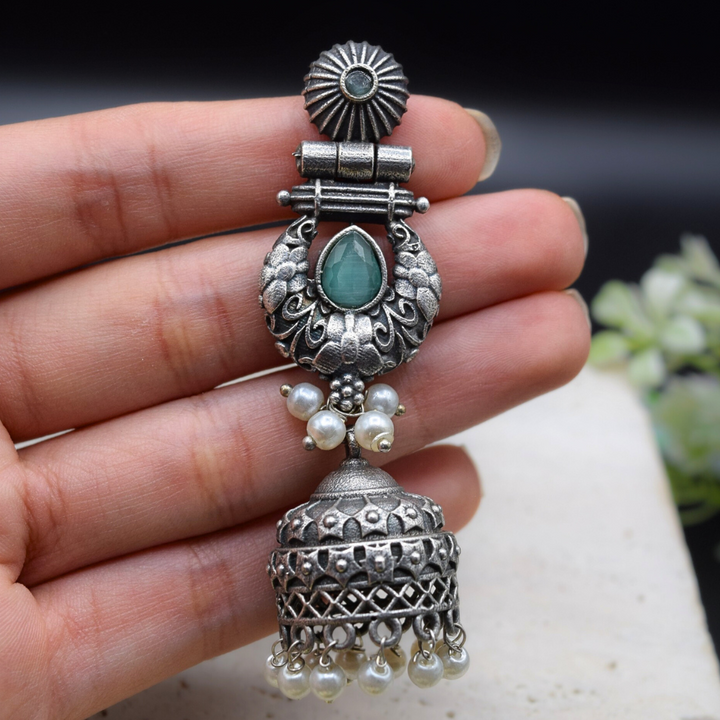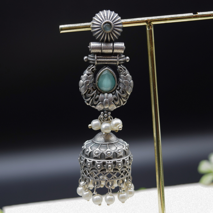 Exquisite jhumkas, showcasing diverse metallic finishes and adorned with luminous pearls. These beautifully designed pieces add a touch of antique charm and glamour, perfect for party wear or enhancing your unique style