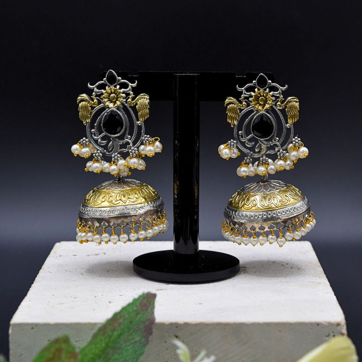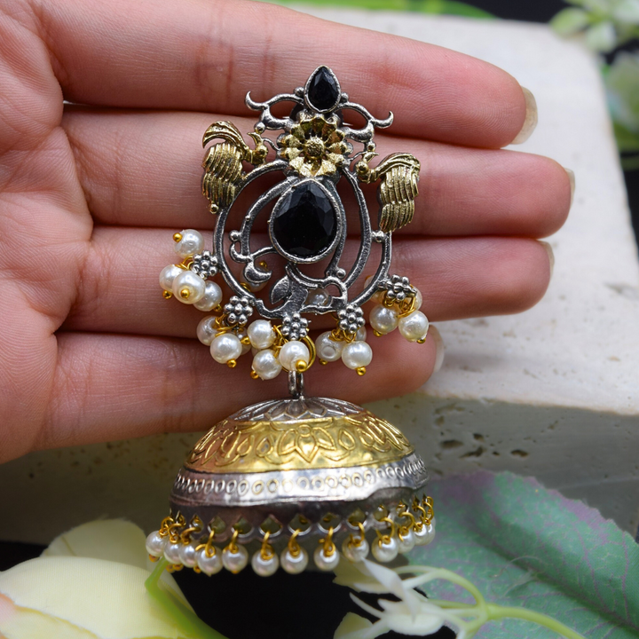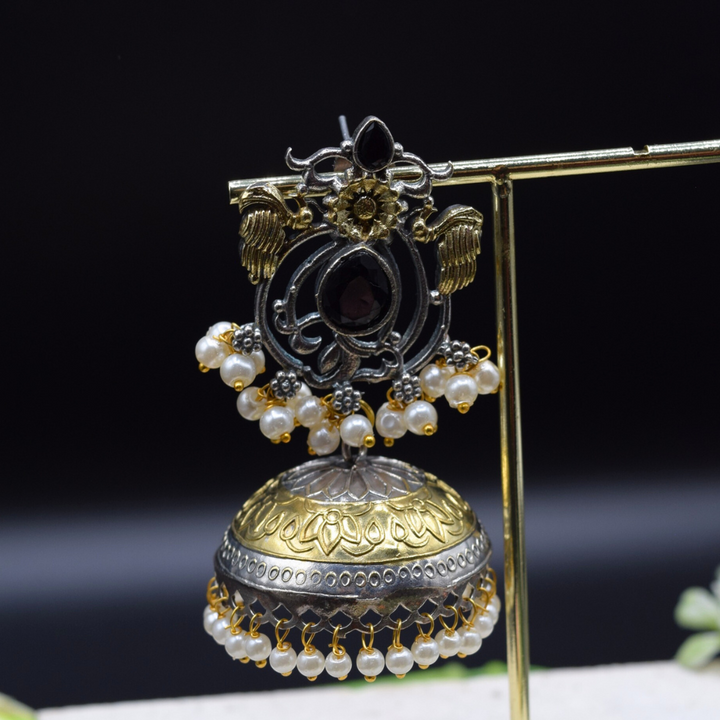 Exquisite jhumkas, showcasing diverse metallic finishes and adorned with luminous pearls. These beautifully designed pieces add a touch of antique charm and glamour, perfect for party wear or enhancing your unique style