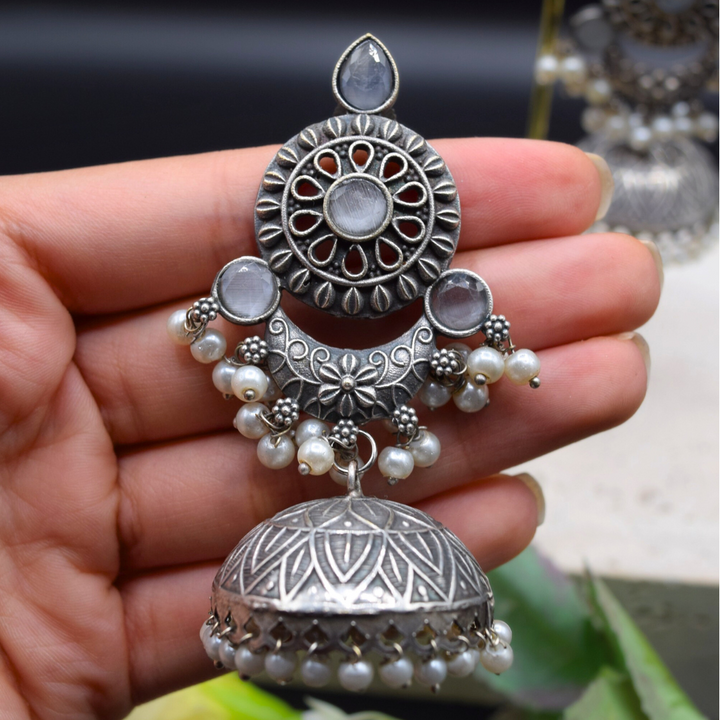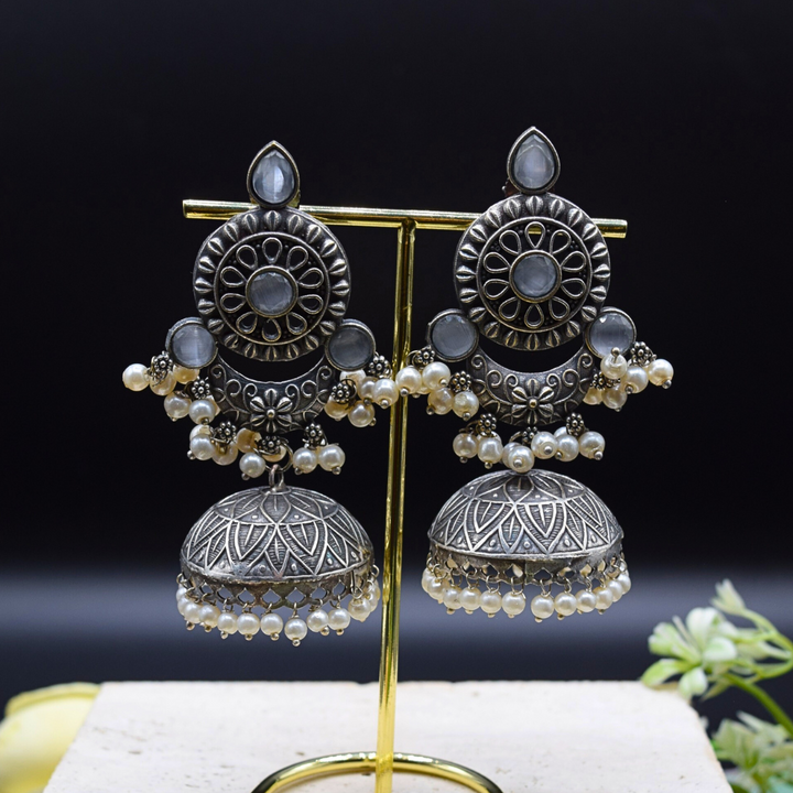 Exquisite jhumkas, showcasing diverse metallic finishes and adorned with luminous pearls. These beautifully designed pieces add a touch of antique charm and glamour, perfect for party wear or enhancing your unique style