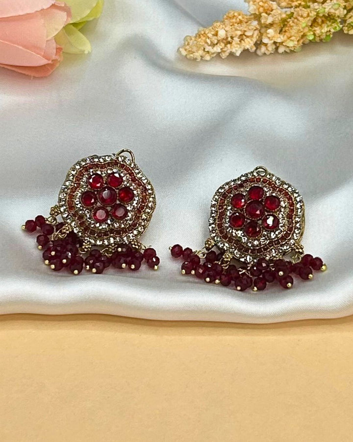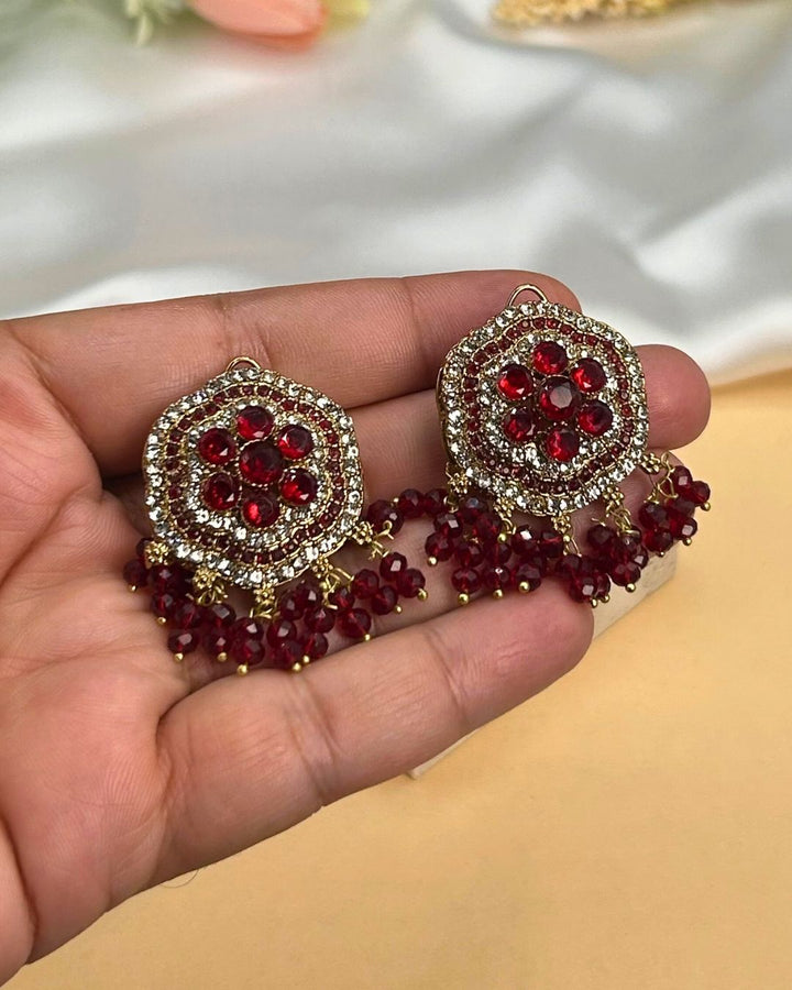 These stunning chandelier earrings feature intricate stone work in a vibrant ruby red hue, making them a bold and elegant addition to any outfit. Crafted from high-quality metal, these earrings exude a timeless and luxurious charm. Elevate your look with this single piece that embodies craftsmanship and sophistication. Brand name: Aurelia.Pk.