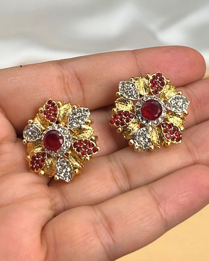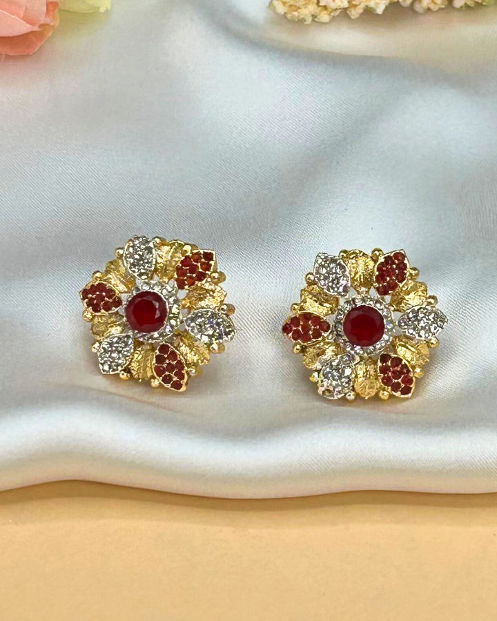 These elegant stud earrings feature a single piece design crafted from shiny metal in a gorgeous ruby red color, showcasing a stunning floral motif. The intricate detailing and vibrant hue make these accessories a standout addition to any outfit, adding a touch of bold yet feminine charm. Perfect for those who appreciate unique and eye-catching jewelry pieces. Brand: Aurelia.Pk.