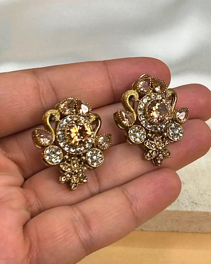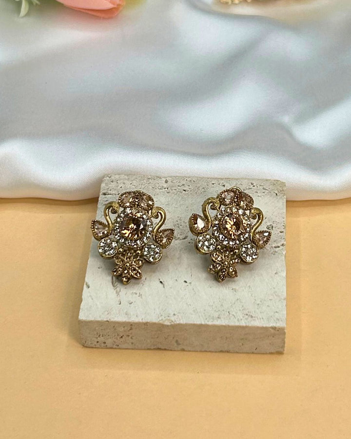 This elegant stud earring in champagne-toned metal is a must-have accessory. Its minimalist design is both timeless and versatile, adding a touch of sophistication to any outfit. Perfect for the modern woman who appreciates understated elegance. Product ID: E1234. Brand Name: Aurelia.Pk.