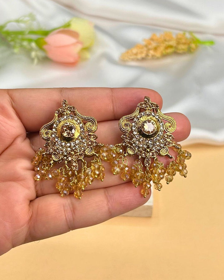 Add a touch of glamour to your look with these exquisite Chardelier Earrings. Crafted with stone work detailing in a stunning champagne hue, these earrings exude elegance and sophistication. The metal base adds a touch of durability to these statement pieces, making them perfect for special occasions or everyday wear. Product ID: None Brand name: Aurelia.Pk