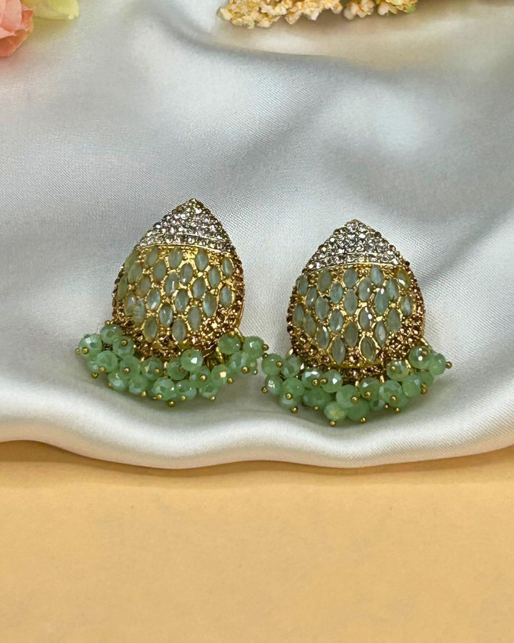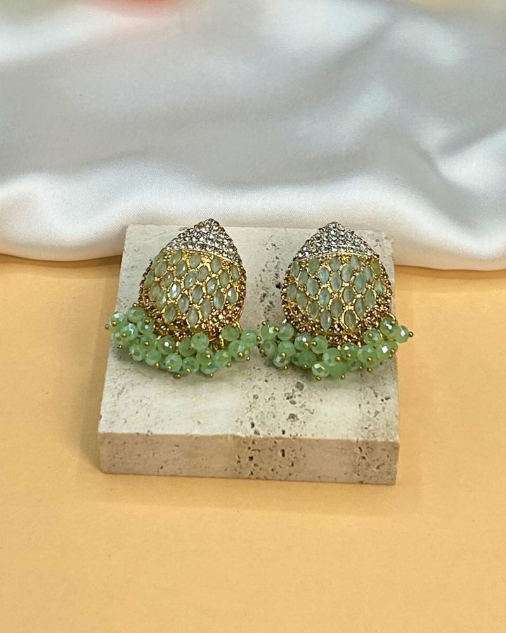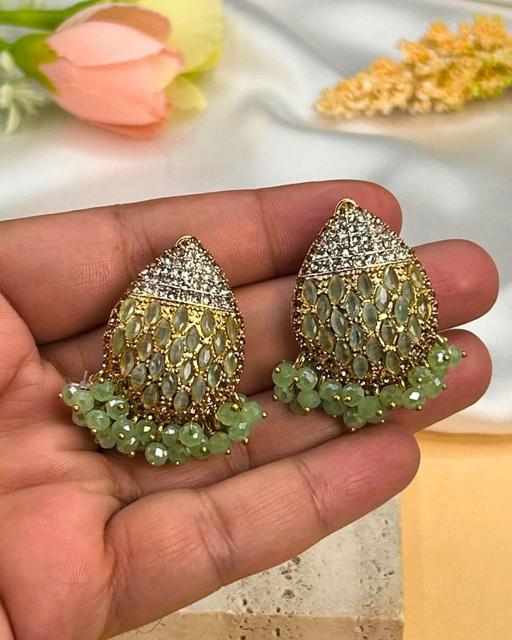 These stunning dangle earrings in pistachio green feature intricate stone work on a metal base, exuding a delicate and elegant charm. Perfect for adding a touch of sophistication to any outfit, these earrings stand out with their unique design and timeless appeal. Elevate your accessory game with these statement pieces from Aurelia.Pk.