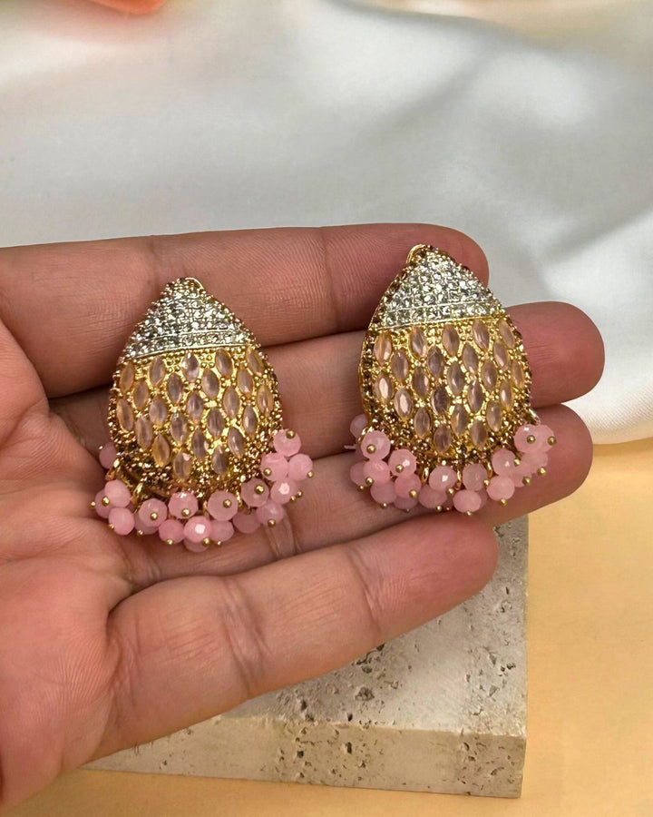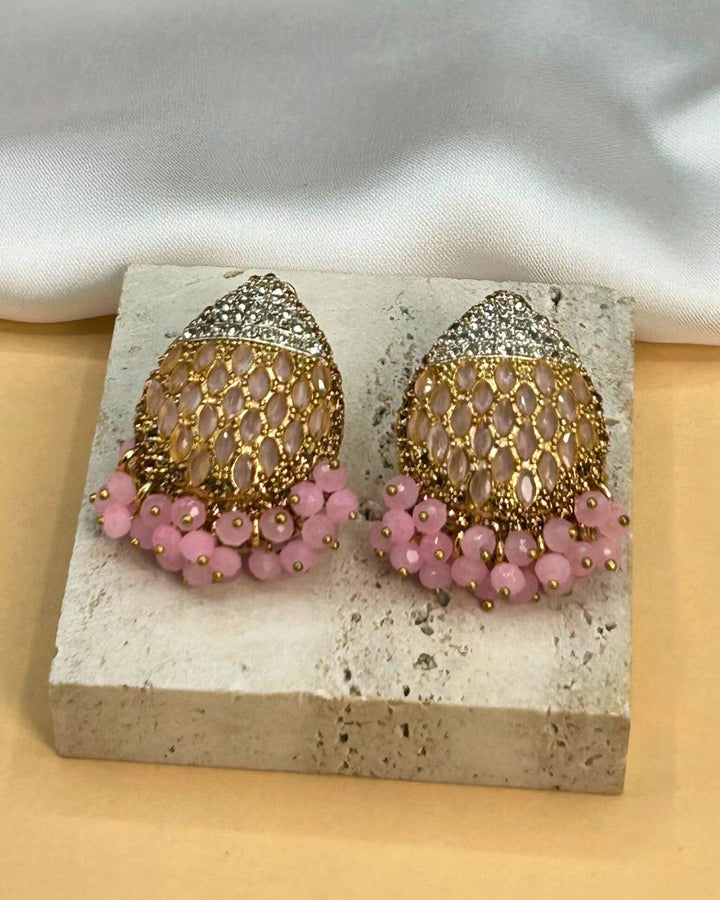 These eye-catching pink stone ear-cuffs are the perfect accessory to elevate your look. Handcrafted with intricate stone work on high-quality metal, these earrings are both delicate and bold, adding a touch of elegance to any outfit. Stand out with this stunning piece from Aurelia.Pk.