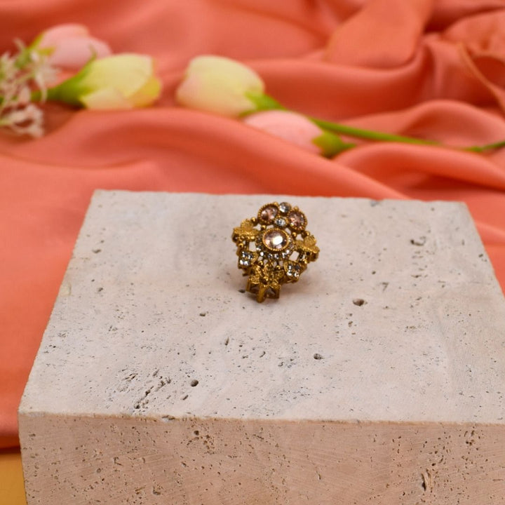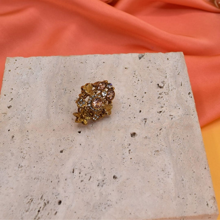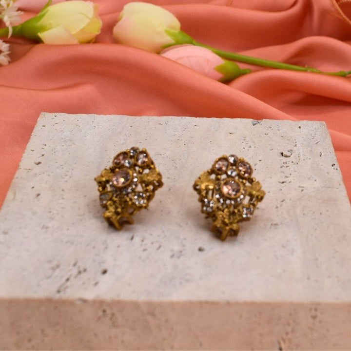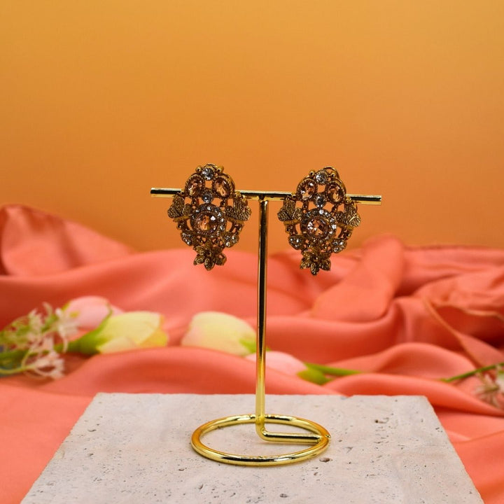 These gold-tone earrings feature a diamond shape design with intricate details. The earrings are encrusted with small, clear stones and accented with red stones in a floral pattern. Each earring is finished with a single, white pearl drop. They are suitable for formal occasions