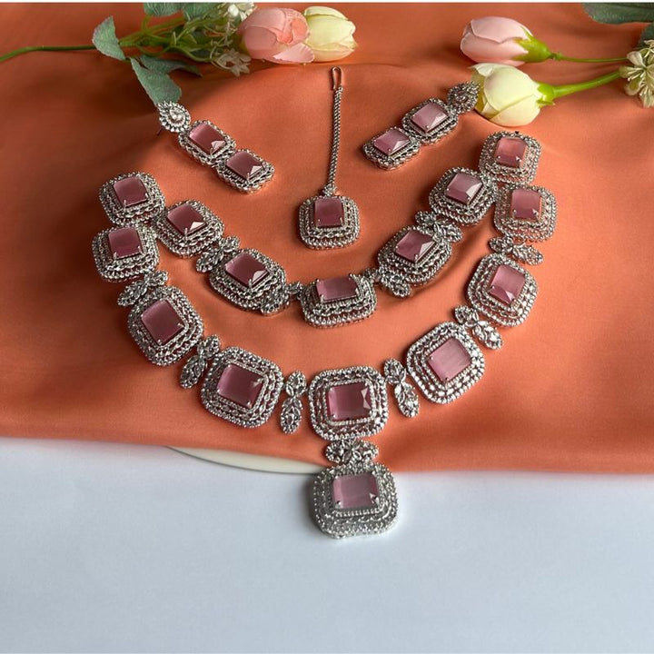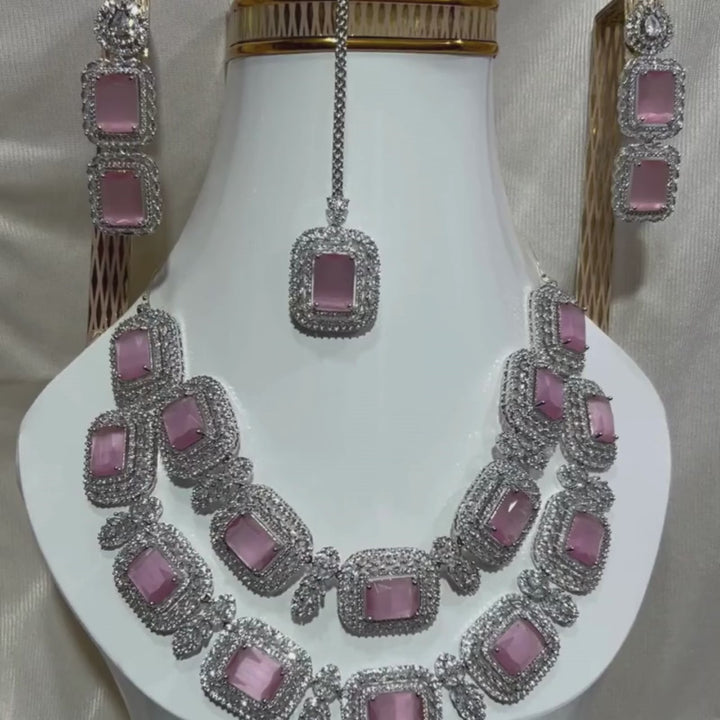 Radiate delicate charm with this enchanting silver-toned set, adorned with soft pink rose quartz stones that evoke the blush of a spring garden. Inspired by the romance of Kashmiri floral motifs, the necklace and earrings feature intricate filigree work and oxidized silver accents for a vintage-meets-modern appeal. Crafted from hypoallergenic brass and rhodium-plated for lasting brilliance, this versatile set pairs beautifully with pastel sarees, ivory Anarkalis, or even contemporary pastel gowns. Ideal for engagements, daytime weddings, or festive brunches, it adds a touch of understated elegance to every ensemble. Sales Package: 1 Necklace,2 Earrings,1 Maangtika