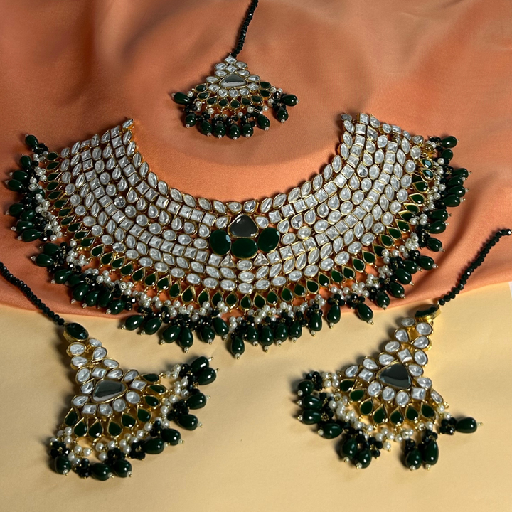 Channel regal sophistication with this handcrafted set, where rich emerald-green crystals cascade across a gold-plated brass base. Inspired by the opulence of royal Indian palaces, the peacock-inspired enamel work and vine-like patterns add a touch of Mughal grandeur. Ideal for pairing with jade-green Banarasi sarees or contemporary gowns, this necklace and choker set is a masterpiece for receptions or cultural galas. Sales Package: 1 Necklace,2 Earrings,1 Maangtika, 1 Jhoomer