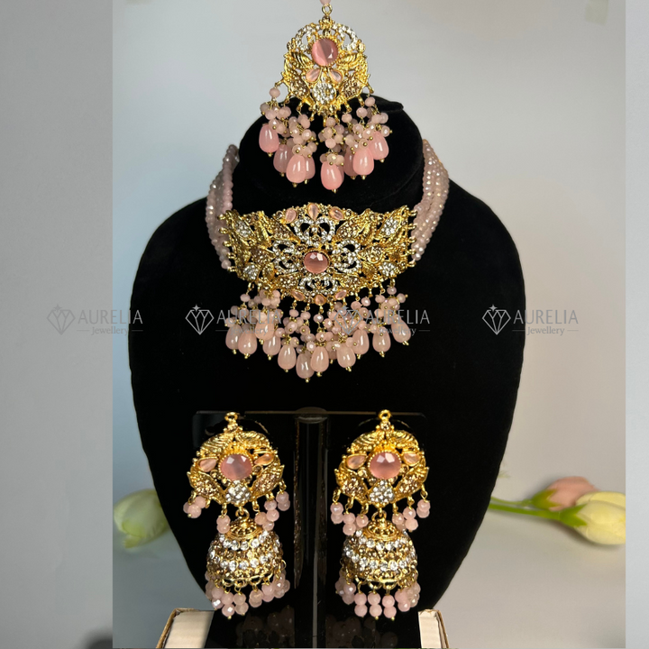 This exquisite Namasya Mother of Pearl Choker Set features a gold-plated choker with a large, pink mother-of-pearl centerpiece, adorned with sparkling stones. It includes matching dangling earrings with pink mother-of-pearl drops, perfect for adding a touch of elegance to any outfit. The set is ideal for weddings and special occasions, symbolizing love and purity.
