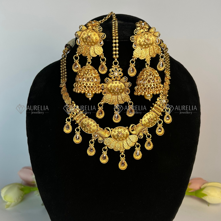 This elegant artificial jewelry set features a gold-tone necklace, earrings, and tikka with intricate designs. The necklace has a series of ornate pendants, while the earrings are designed with traditional jhumka style. The set is perfect for adding a touch of glamour to any occasion.