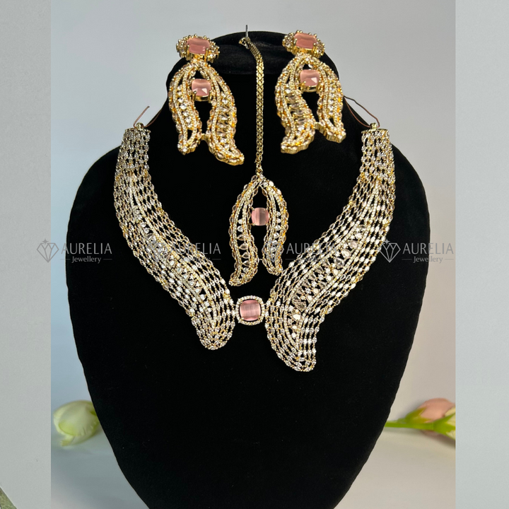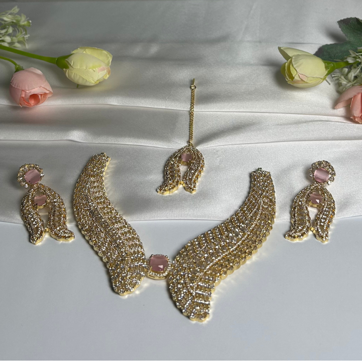 Embrace pure luxury with this resplendent gold-on-gold set, where gleaming golden cubic zirconia stones cascade over a rich gold-plated brass base. Inspired by the grandeur of royal Indian craftsmanship, the intricate filigree work and sunburst motifs evoke the opulence of a maharajaÕs treasure. Lightweight yet lavish, this necklace and earring duo is designed to elevate Banarasi silk sarees, metallic lehengas, or even floor-length evening gowns. Finished with anti-tarnish plating, itÕs a timeless choice for bridal trousseaus, grand receptions, or milestone celebrations