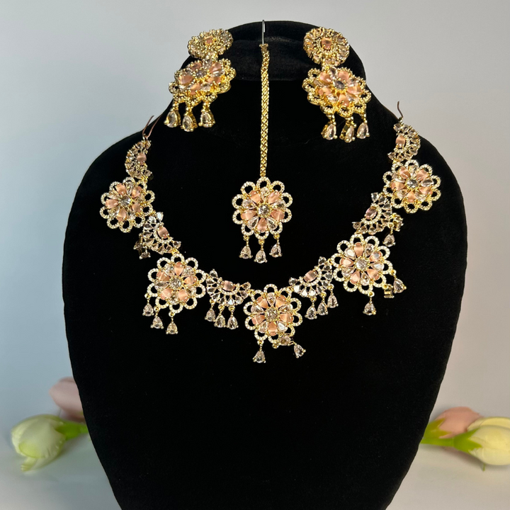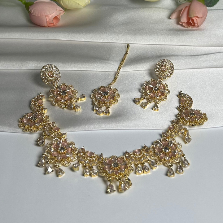 Embrace pure luxury with this resplendent gold-on-gold set, where gleaming golden cubic zirconia stones cascade over a rich gold-plated brass base. Inspired by the grandeur of royal Indian craftsmanship, the intricate filigree work and sunburst motifs evoke the opulence of a maharajaÕs treasure. Lightweight yet lavish, this necklace and earring duo is designed to elevate Banarasi silk sarees, metallic lehengas, or even floor-length evening gowns. Finished with anti-tarnish plating, itÕs a timeless choice for bridal trousseaus, grand receptions, or milestone celebrations