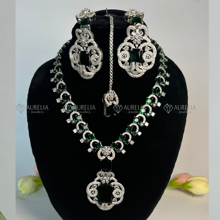 Channel regal sophistication with this handcrafted set, where rich emerald-green crystals cascade across a gold-plated brass base. Inspired by the opulence of royal Indian palaces, the peacock-inspired enamel work and vine-like patterns add a touch of Mughal grandeur. Ideal for pairing with jade-green Banarasi sarees or contemporary gowns, this necklace and choker set is a masterpiece for receptions or cultural galas.