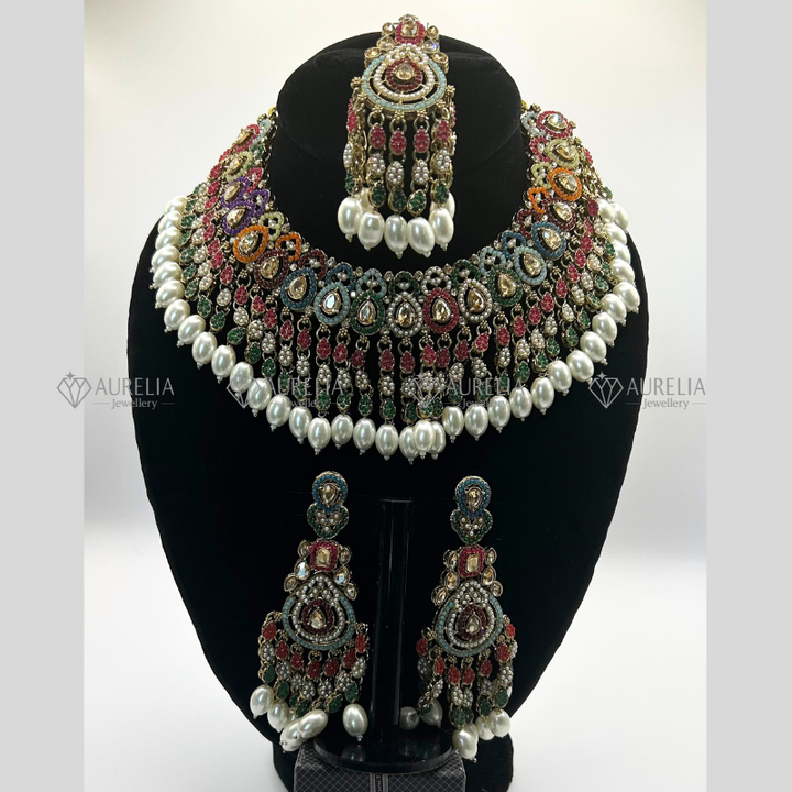 Nauratan jewellery set with gold-plated choker necklace, matching earrings, tikka, bracelet. Perfect for South Asian brides or festive wear.