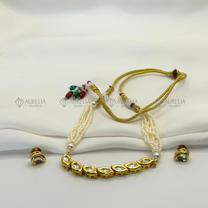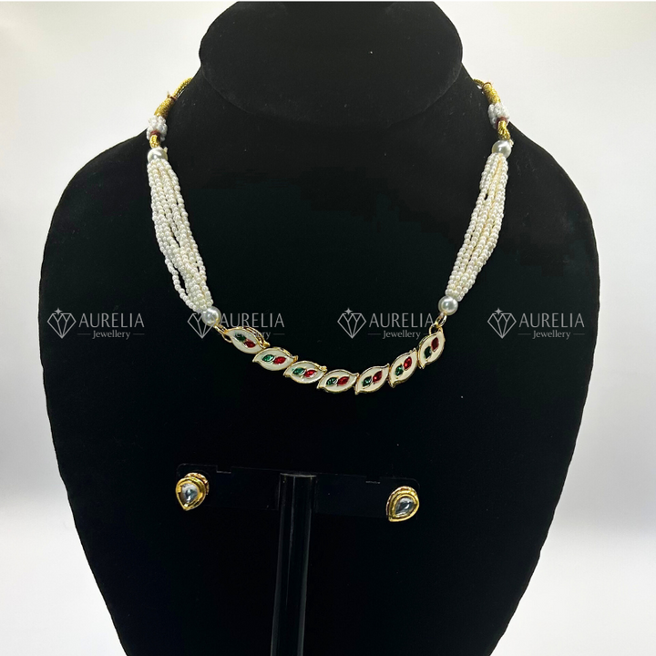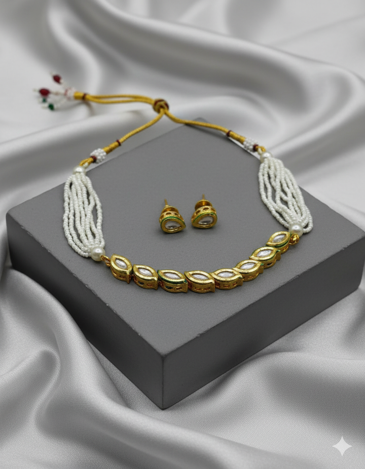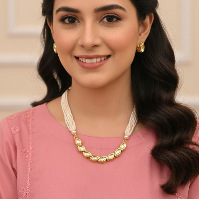 Beautiful Kundan-style necklace & earring set with golden square designs & white beads. Matching earrings complete your look. Perfect for weddings, parties, traditional events.