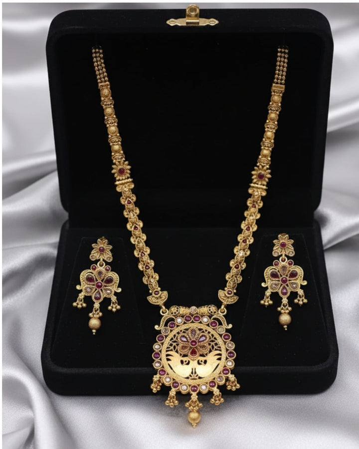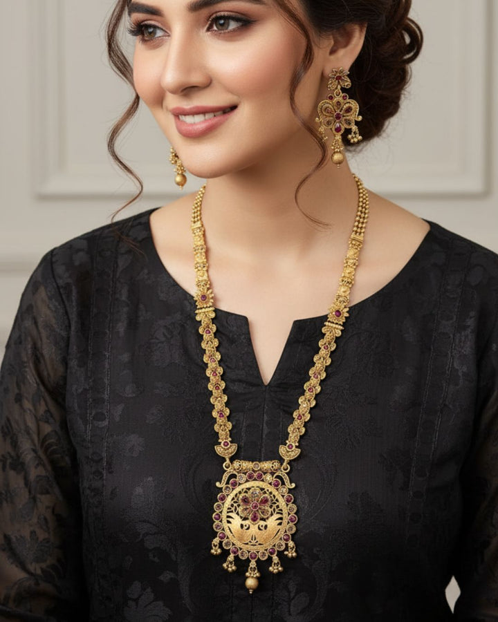 Add classic charm to your outfit with our beautiful Beaded Mala Set. This elegant set includes a multi-strand necklace with lovely pearls and beads, plus matching stud earrings. It features sparkling details for a decent, graceful look. Perfect for any special occasion