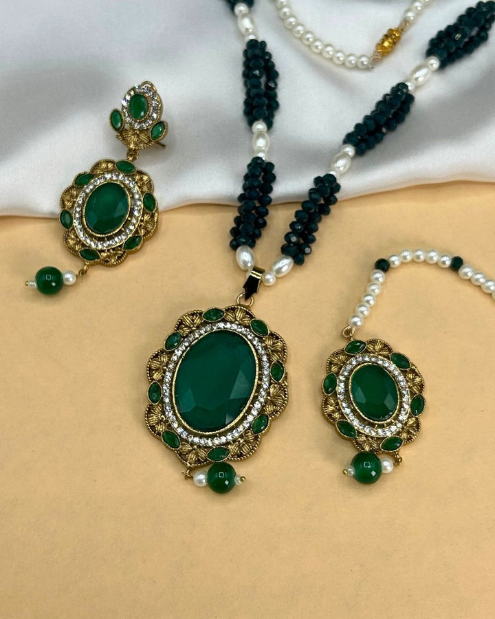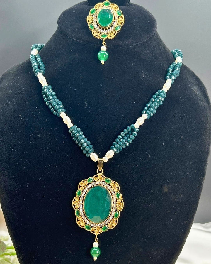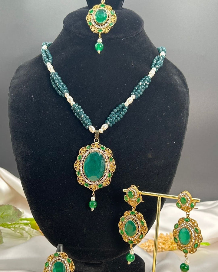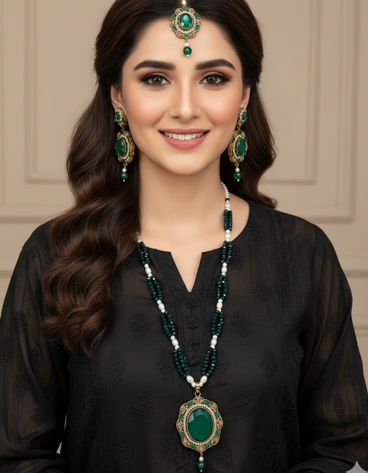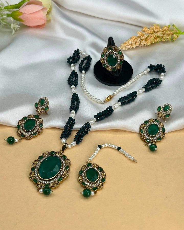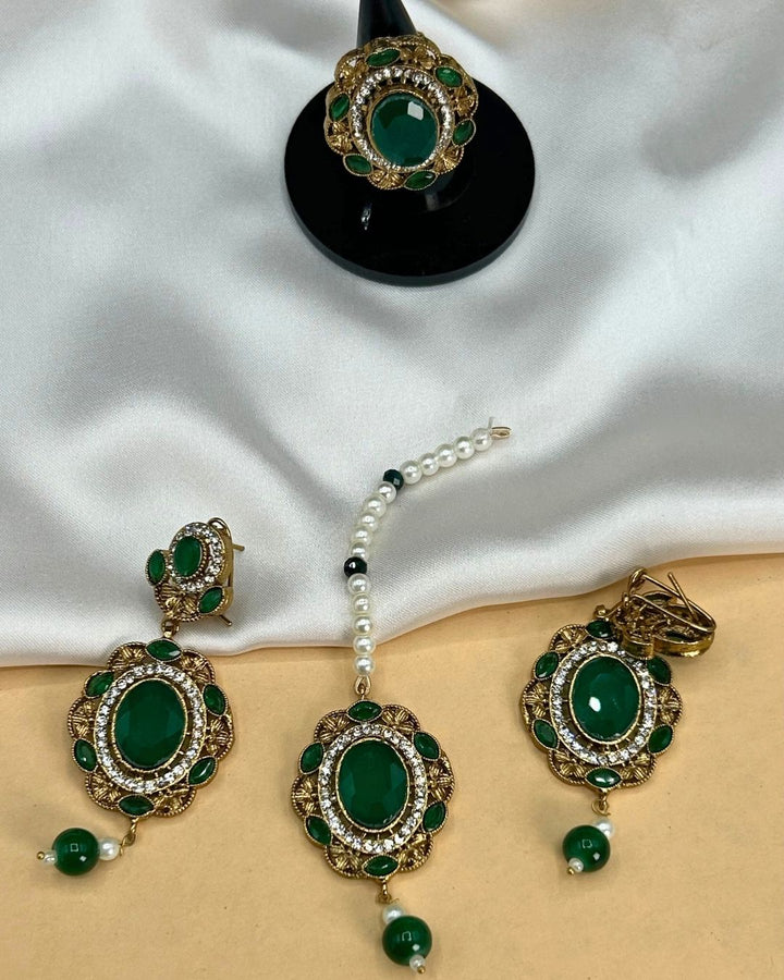 Elevate your accessory game with this mesmerizing 4-piece jewelry set. Each piece features intricate stone work on dark green metal, creating a striking and elegant look. Perfect for adding a touch of sophistication to any outfit, this set is a must-have for those who appreciate unique and timeless jewelry pieces. Brand: Aurelia.Pk.