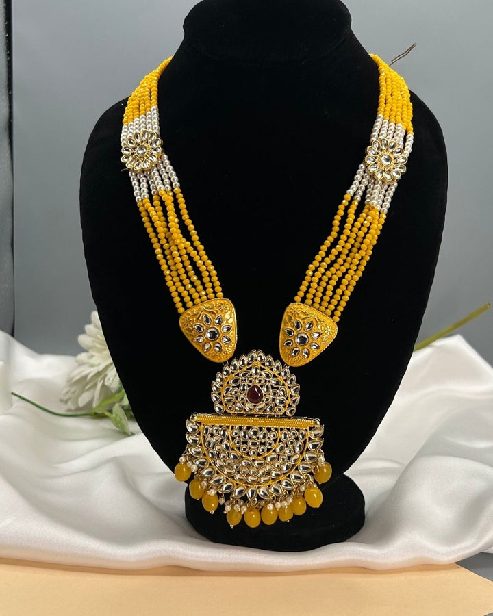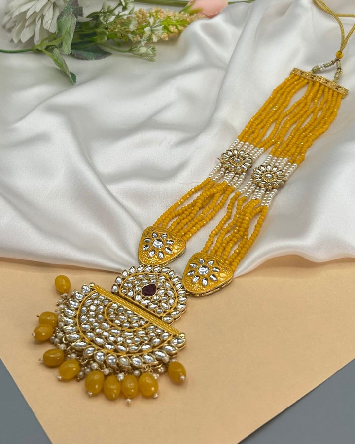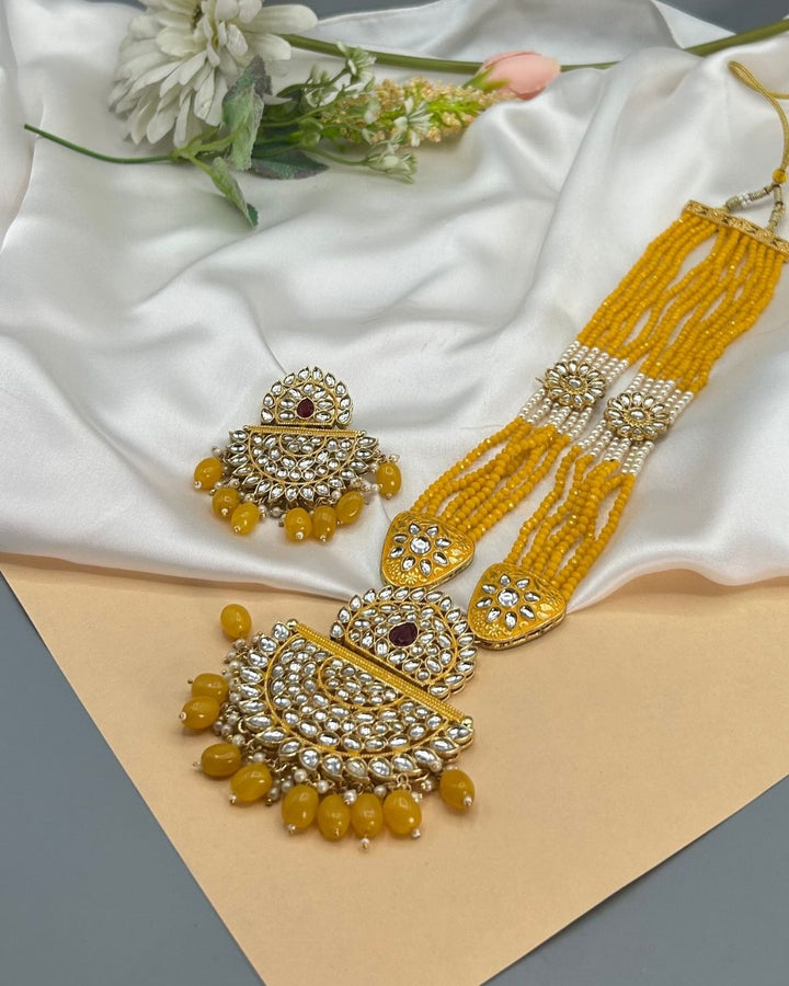 This charming jewelry set features a delightful combination of two metal pieces adorned with intricate stone work in a soothing mellow yellow hue. The set exudes a delicate yet stunning appeal, perfect for adding a touch of elegance to any outfit. Elevate your accessory game with this timeless and tasteful set from Aurelia.Pk.