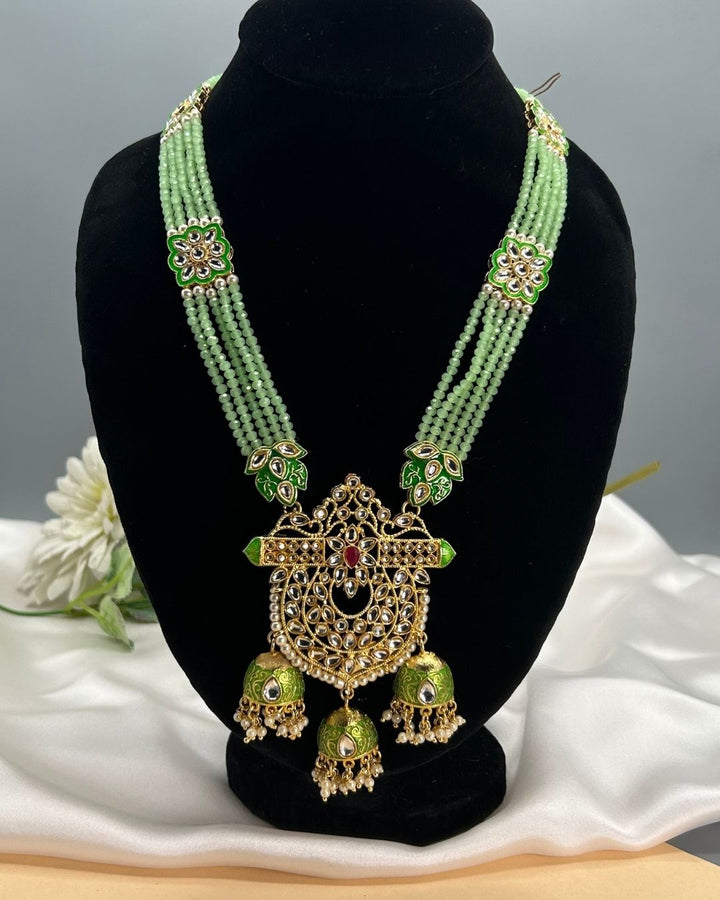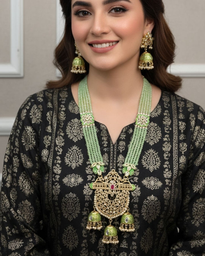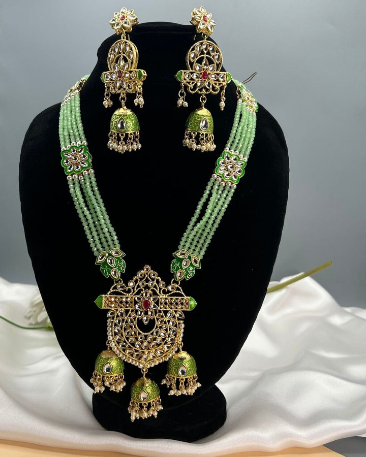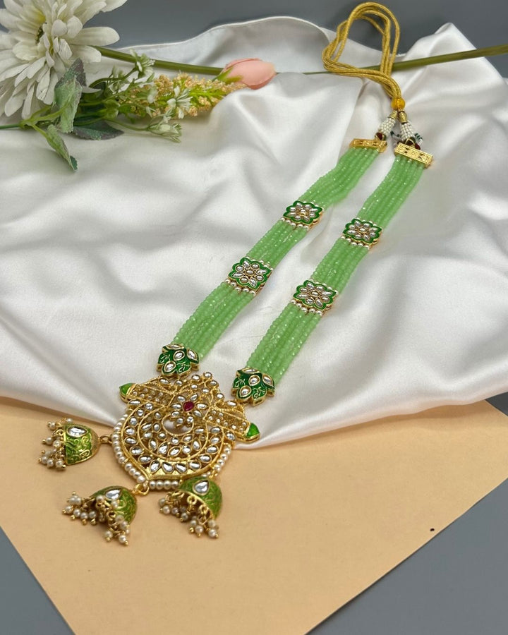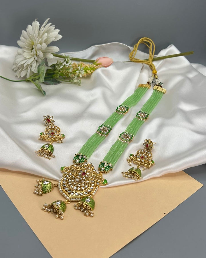 This elegant two-piece jewelry set features delicate pastel green stones set in metal. The intricate stone work adds a touch of sophistication to this stunning set, making it a timeless addition to any jewelry collection. Perfect for adding a pop of color to any outfit.