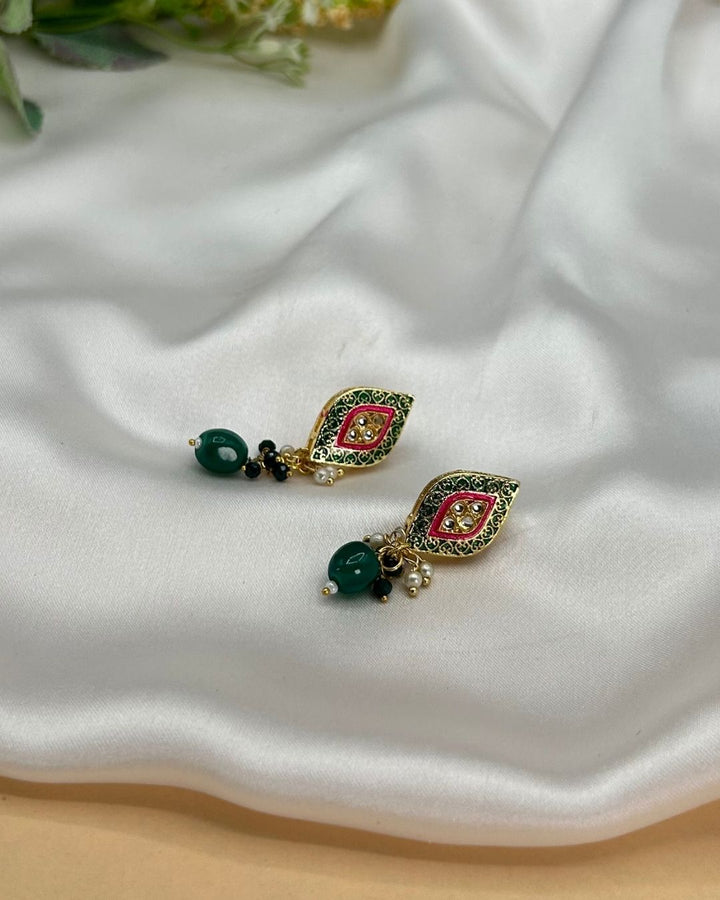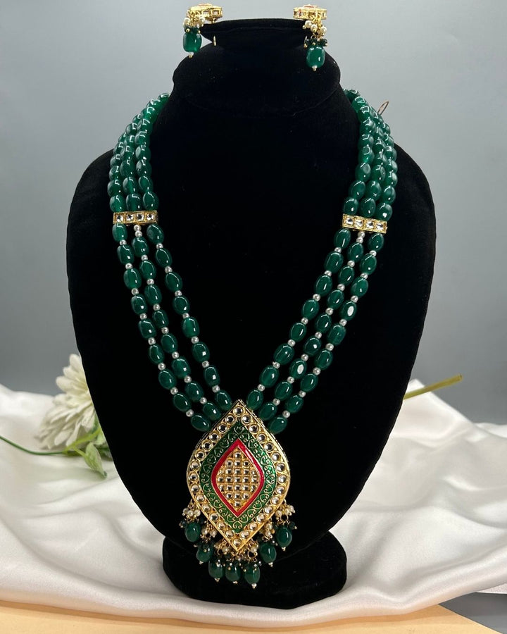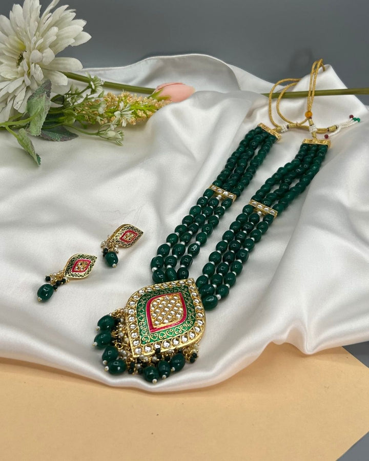 This stunning jewelry set includes a pair of dark green stone-adorned earrings and a matching necklace, perfectly crafted with intricate stone work on metal. Elevate your look with this elegant and mesmerizing set, adding a touch of sophistication to any outfit. Product ID: None. Brand Name: Aurelia.Pk.