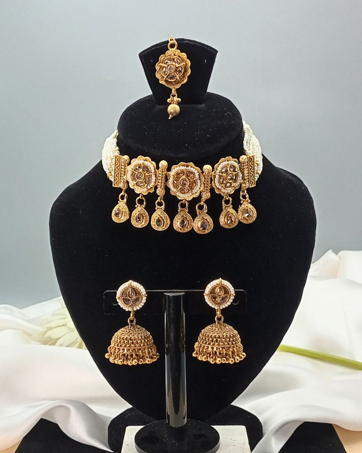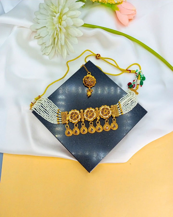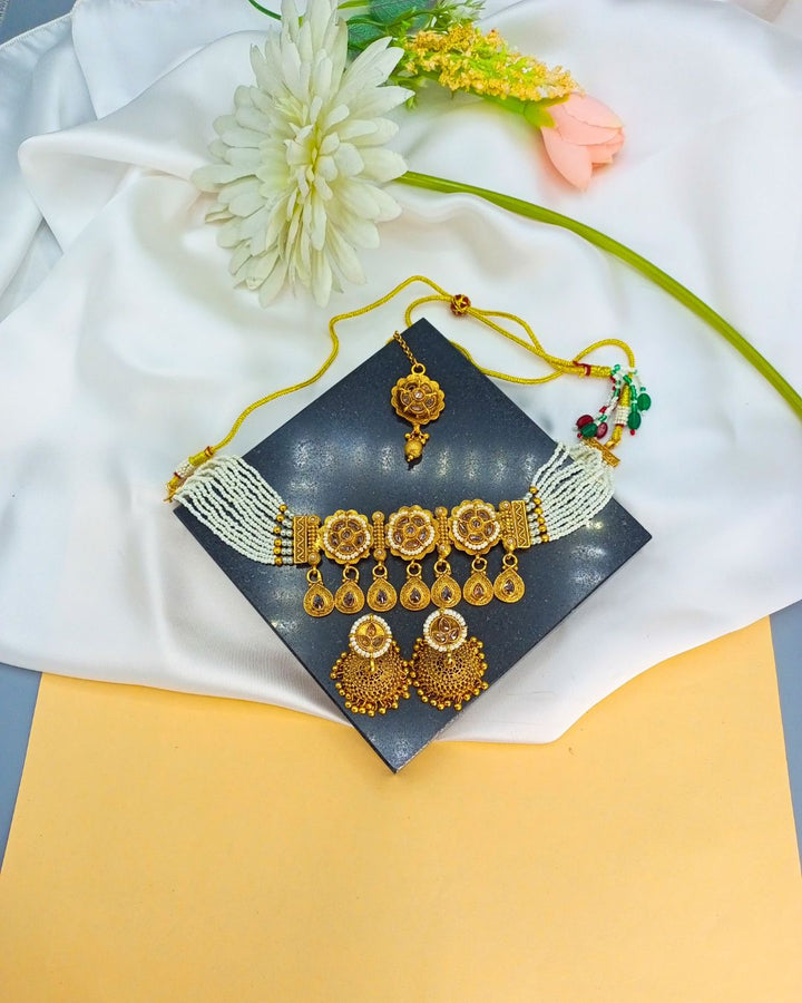 Add classic charm to your outfit with our beautiful Rajwari Ethnic Jewelry Set. This elegant set includes a multi-strand necklace with lovely pearls and beads, plus matching earrings. It features sparkling details for a decent, graceful look. Perfect for any special occasion