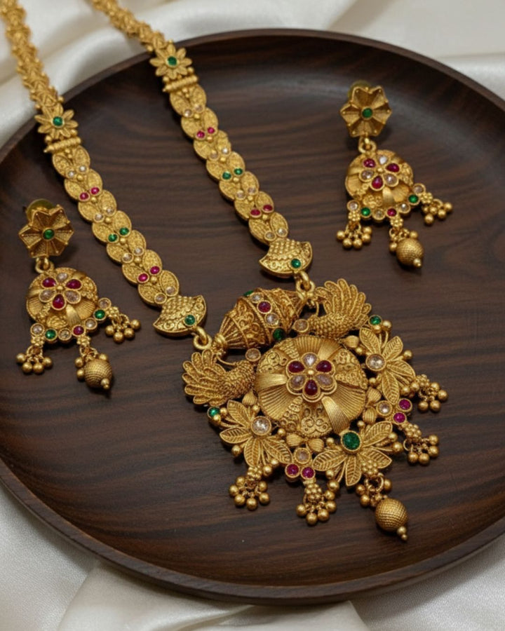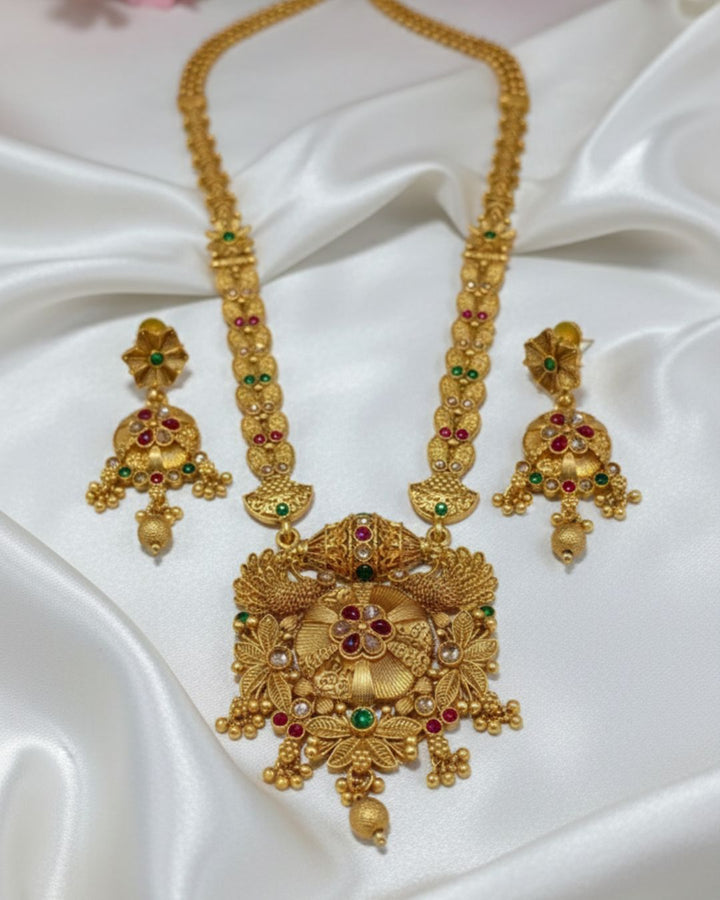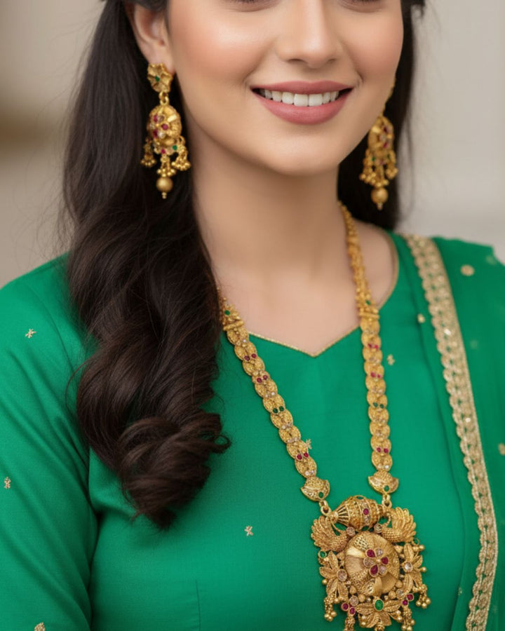 Add classic charm to your outfit with our beautiful Rajwari Ethnic Jewelry Set. This elegant set includes a multi-strand necklace with lovely pearls and beads, plus matching earrings. It features sparkling details for a decent, graceful look. Perfect for any special occasion
