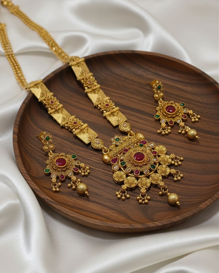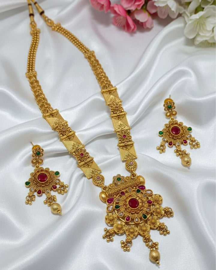 Add classic charm to your outfit with our beautiful Rajwari Ethnic Jewelry Set. This elegant set includes a multi-strand necklace with lovely pearls and beads, plus matching earrings. It features sparkling details for a decent, graceful look. Perfect for any special occasion