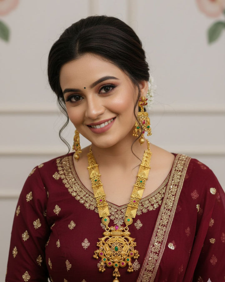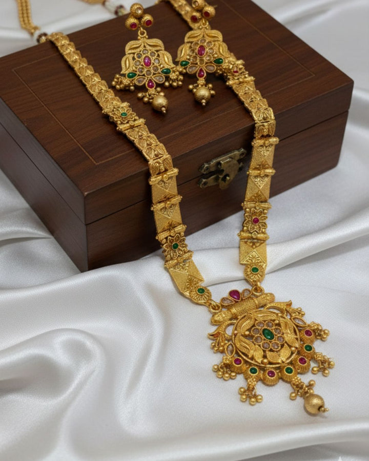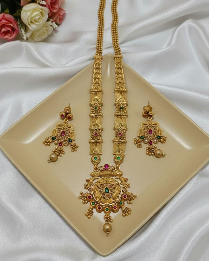 Add classic charm to your outfit with our beautiful Rajwari Ethnic Jewelry Set. This elegant set includes a multi-strand necklace with lovely pearls and beads, plus matching earrings. It features sparkling details for a decent, graceful look. Perfect for any special occasion